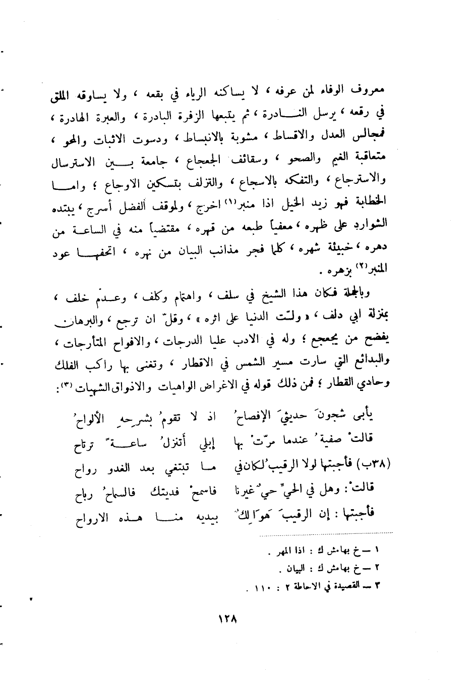 معروف الوفاء لمن عرفه، لا يساكنه الرياء في بقعه، ولا يساوقه الملق في رقعه، يرسل النادرة، ثم يتبعها الزفرة البادرة، والعبرة الهادرة، فمجالس العدل والأقساط، مشوبة بالانبساط، ودسوت الإثبات والمحو، متعاقبة الغيم والصحو، وسقائف الجعجاع، جامعة بين الاسترسال والاسترجاع، والتفكه بالاسجاع، والتزلف بتسكين الأوجاع؛ وأما الخطابة فهو زيد الخيل إذا منبر (1) اخرج، ولموقف الفضل اسرج، يبتده الشوارد على ظهره، معفيا طبعه من قهره، مقتضيا منه في الساعة من دهره، خبيئة شهره، كلما فجر مذانب البيان من نهره، أتحفها عود المنبر (2) بزهره.