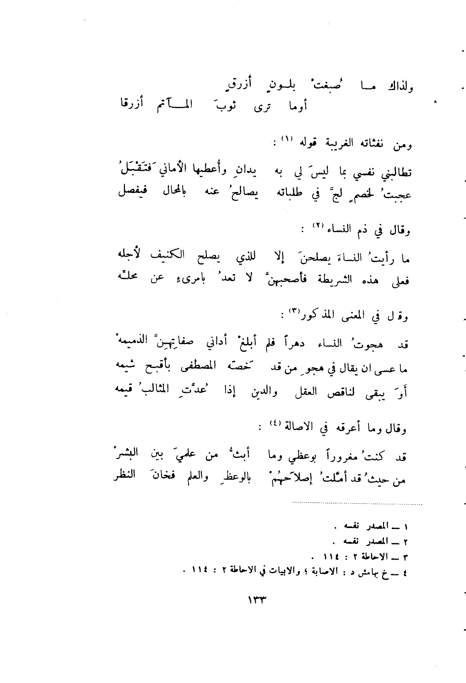 عجبت لخصم لج في طلباته ... يصالح عنه بالمحال فيفصل وقال في ذم النساء (2) :