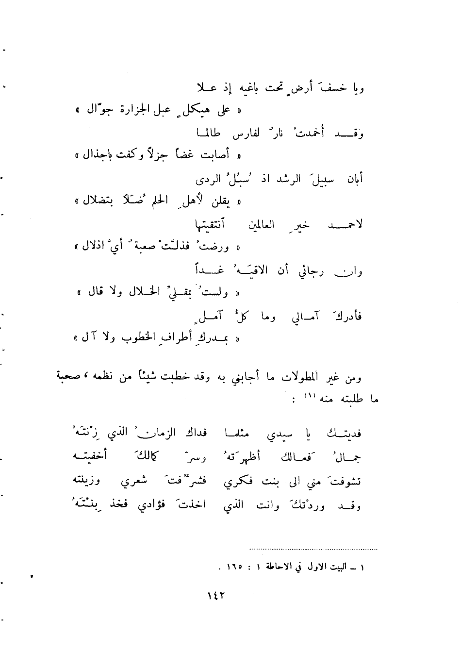 فأدرك آمالي وما كلُ آملٍ ... " بمدرك أطراف الخطوب ولا آل " ومن غير المطولات ما أجابني به وقد خطبت شيئا من نظمه، صحبة ما طلبت منه (1) :
