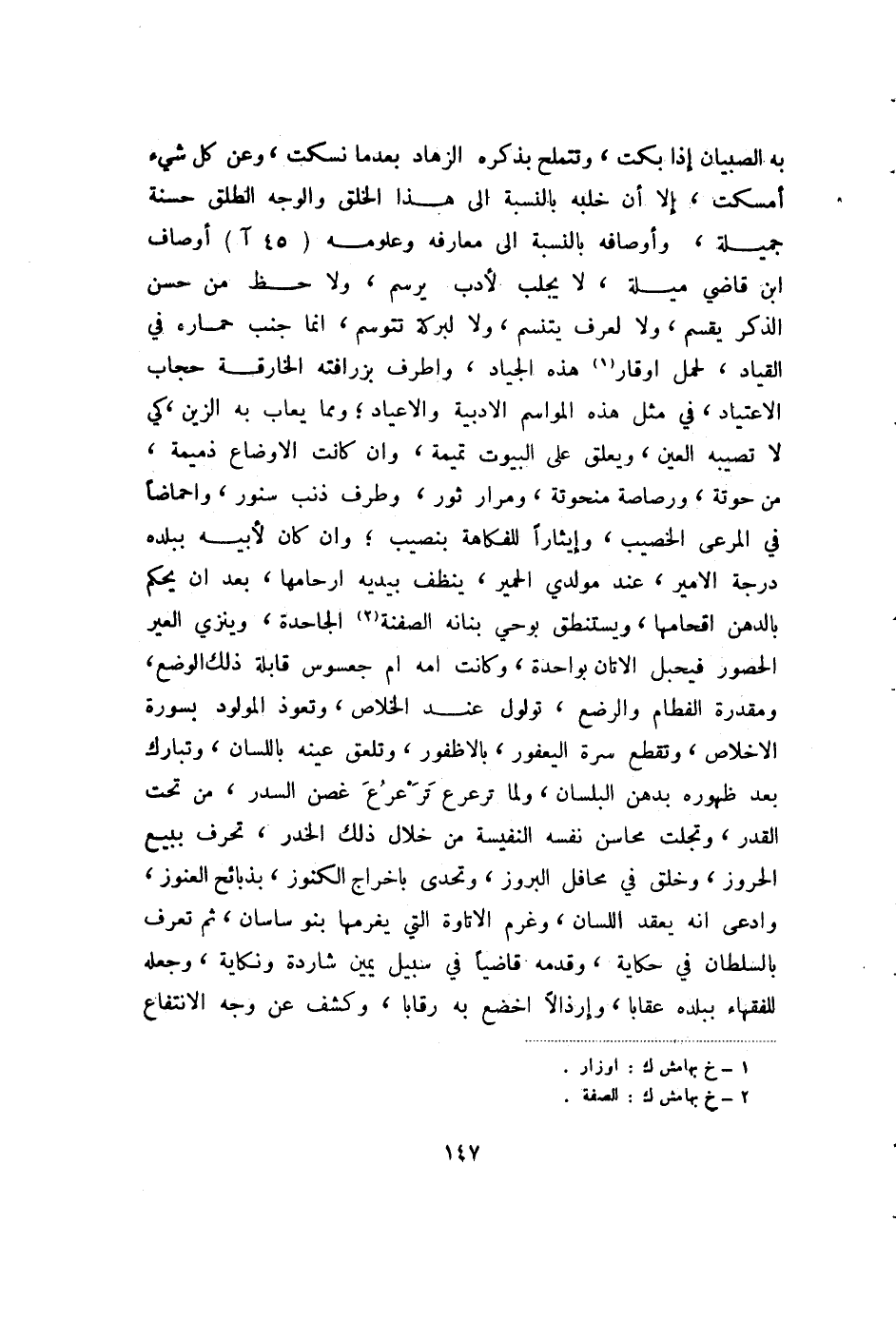 به الصبيان إذا بكت، وتتملح بذكره الزهاد بعدما نسكت، وعن كل شيء أمسكت، إلا أن خلبه بالنسبة إلى هذا والوجه الطلق حسنة جميلة، وأوصافه بالنسبة إلى معارفه وعلومه (45آ) أوصاف ابن قاضي ميلة، لا يجلب لأدب يرسم، ولا حظ من حسن الذكر يقسم، ولا لعرف يتنسم، ولا لبركة تتوسم، إنما جنب حماره في القياد، لحمل أوقار (1) هذه الجياد، وأطراف بزرافته الخارقة حجاب الاعتياد، في مثل هذه المواسم الأدبية والاعياد؛ ومما يعاب به الزين، كي لا تصيبه العين، ويعلق على البيوت تميمة، وان كانت الأوضاع ذميمة، من حوتة، ورصاصة منحوتة، ومرار ثور، وطرف ذنب سنور، وأحماضا في المرعى الخصيب، وإيثارا للفكاهة بنصيب؛ وان كان لأبيه ببلده درجة الأمير، عند مولدي الحمير، ينظف بيديه أرحامها، بعد ان يحكم بالدهن اقحامها، ويستنطق بوحي بنانه الصفنة (2) الجاحدة، وينزي العير الحصور فيحبل الأتان بواحدة، وكانت أمه أم جعسوس قابلة ذلك الوضع، ومقدرة الفطام والرضع، تولول عند الخلاص، وتعوذ المولود بسورة الإخلاص، وتقطع سرة اليعفور، بالاظفور، وتلعق عينه باللسان، وتبارك بعد ظهوره بدهن البلسان، ولما ترعرع ترعرع غصن السدر، من تحت القدر، وتجلت محاسن نفسه النفيسة من خلال ذلك الخدر، تحرف ببيع الحروز، وخلق في محافل البروز، وتحدى بإخراج الكنوز، بذبائح العنوز، وادعى انه يعقد اللسان، وغرم الإتاوة التي يغرمها بنو ساسان، ثم تعرف بالسلطان في حكاية، وقدمه قاضيا في سبيل يمين شاردة ونكاية، وجعله للفقهاء ببلده عقابا، وأرذالا اخضع به رقابا، وكشف عن وجه الانتفاع