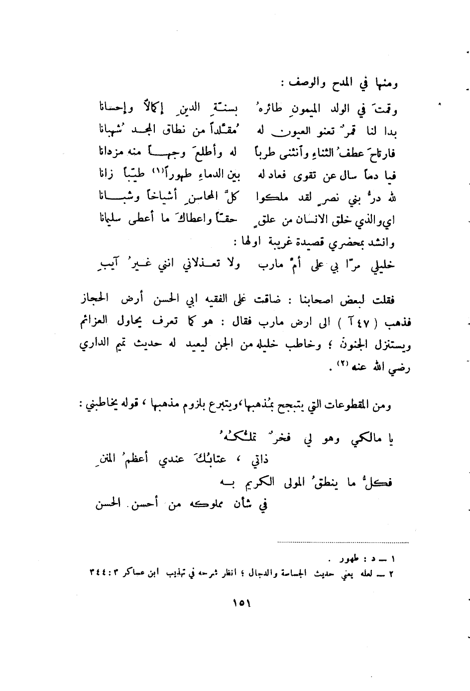 خليلي مرا بي على أم مارب ... ولا تعذلاني إنني غير آيب فقلت لبعض أصحابنا: ضاقت على الفقيه أبي الحسن ارض الحجاز فذهب (47ا) إلى ارض مارب فقال: ما كما تعرف يحاول العزائم ويستنزل الجنون، وخاطب خليله من الجن ليعيد له حديث تميم الداري رضي الله عنه (2) .