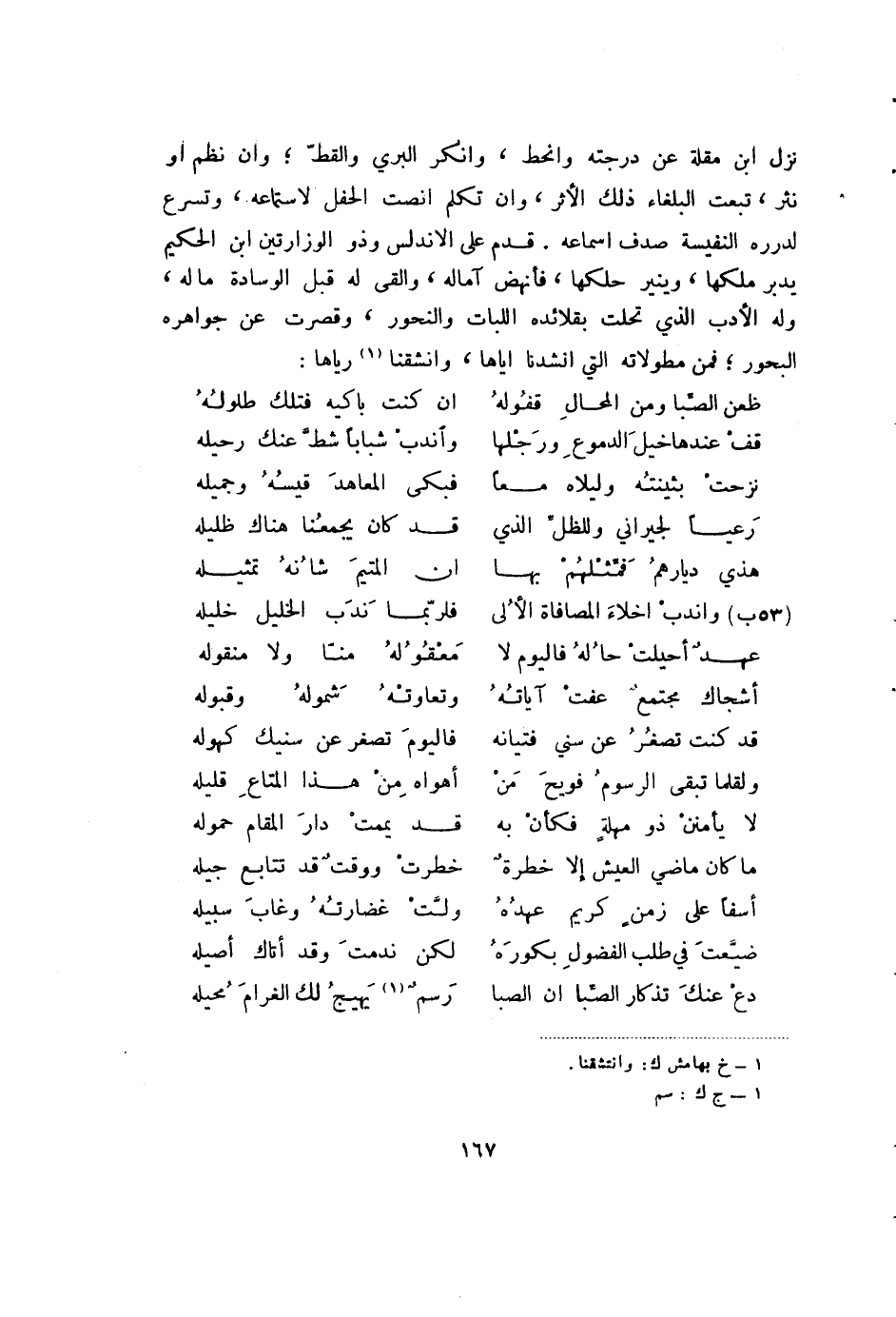 نزل ابن مقلة عن درجته وانحط، وأنكر البري والقط؛ وان نظم أو نثر، تبعت البلغاء ذلك الأثر، وان تكلم أنصت الحفل لاستماعه،وتسرع لدرره النفيسة صدف أسماعه. قدم على الأندلس وذو الوزارتين ابن الحكيم يدبر ملكها، وينير حلكها، فانهض آماله، وألقى له قبل الوسادة ماله،وله الدب الذي تحلت بقلائده اللبات والنحور، وقصرت عن جواهره البحور؛ فمن مطولاته التي أنشدها إياها، وأنشقنا (1) رياها: