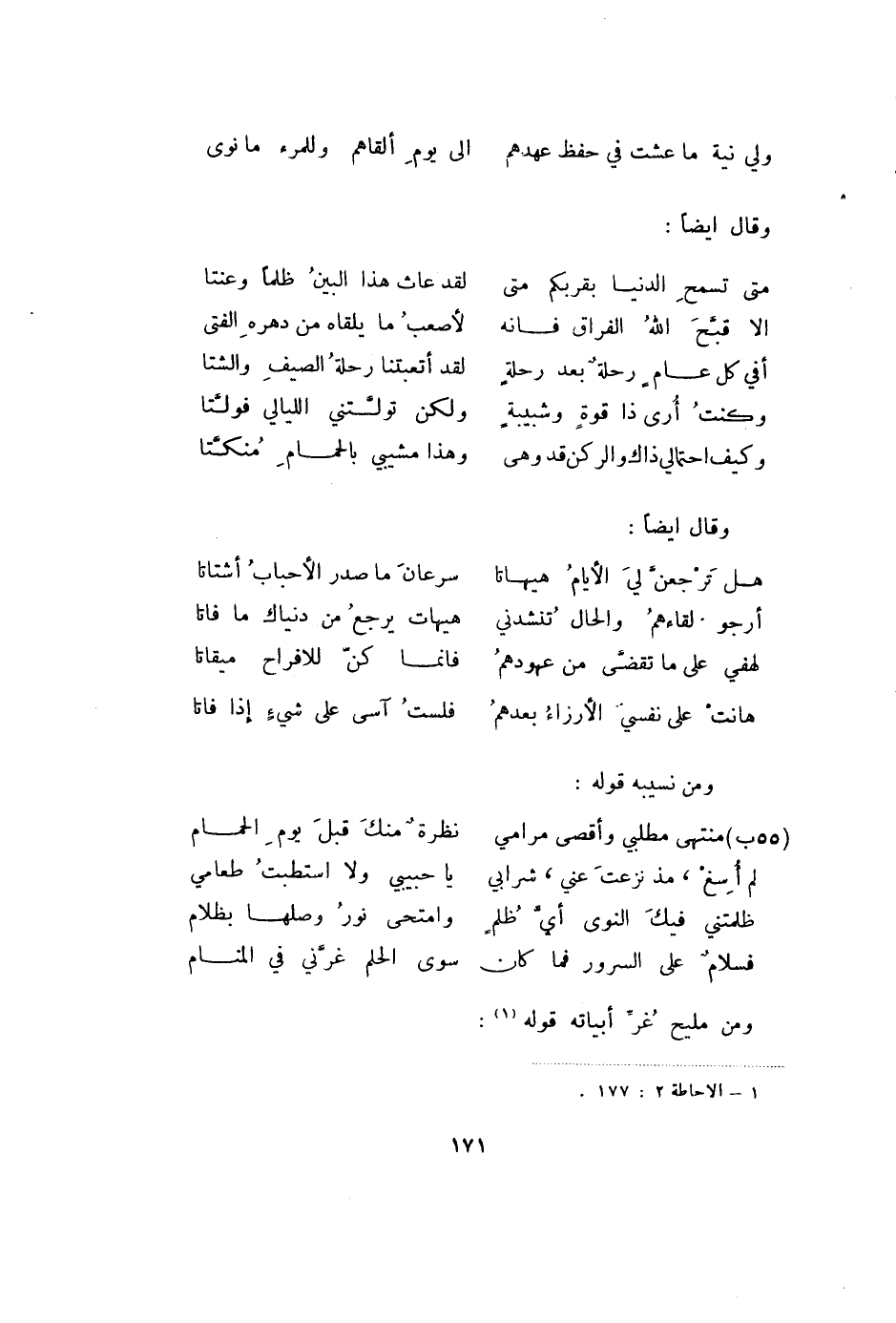 ولي نية ما عشت في حفظ عهدهم ... إلى يوم ألقاهم وللمرء ما نوى وقال أيضا: