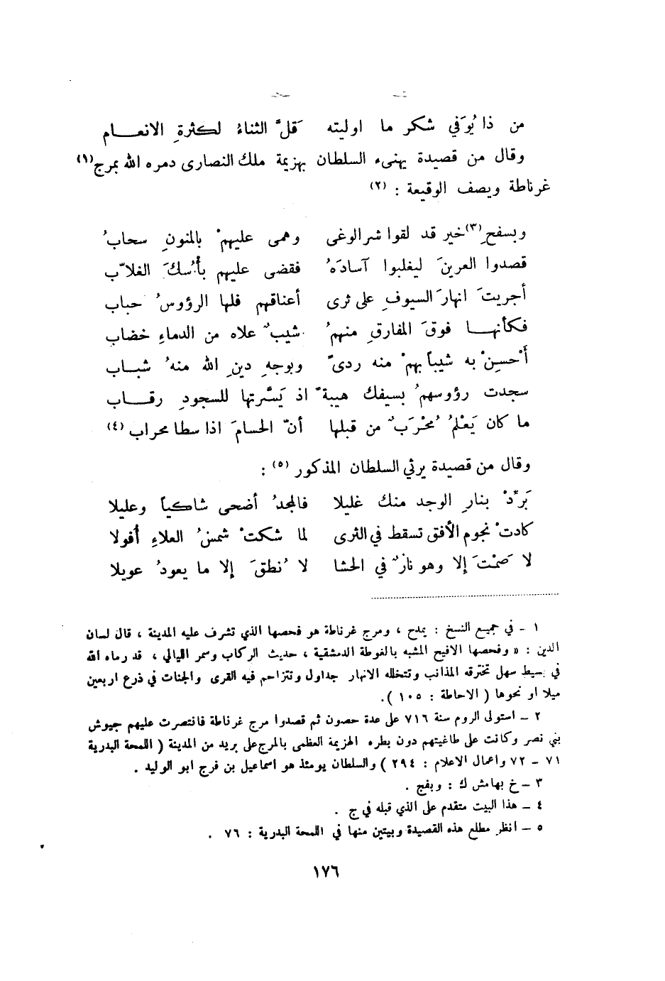 من ذا يوفي شكر ما أوليته ... قل الثناء لكثرة الإنعام وقال من قصيدة يهنئ السلطان بهزيمة ملك النصارى دمره الله بمرج (1) غرناطة ويصف الوقيعة: (2)