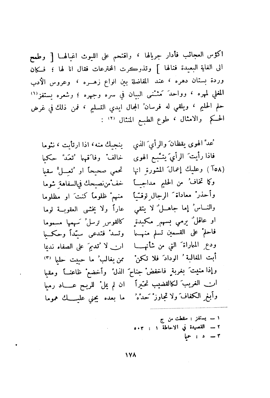 اكؤس العجائب فأدار جريالها، واقتحم على الليوث اغيالها [وطمح إلى الغاية البعيدة فنالها] وتذوكرت المخترعات فقال إن لها؛فكان وردة بستان دهره، عند المفاضلة بين أنواع زهره، وعروس الأدب المغلي لمهره، وواحد مثنى البيان في سره وجهره؛ وشعره يستفز (1) حلم الحليم، ويلقي له فرسان المجال أيدي التسليم، فمن ذلك في غرض الحكم والأمثال، طوع الطبع المنثال (2) :
