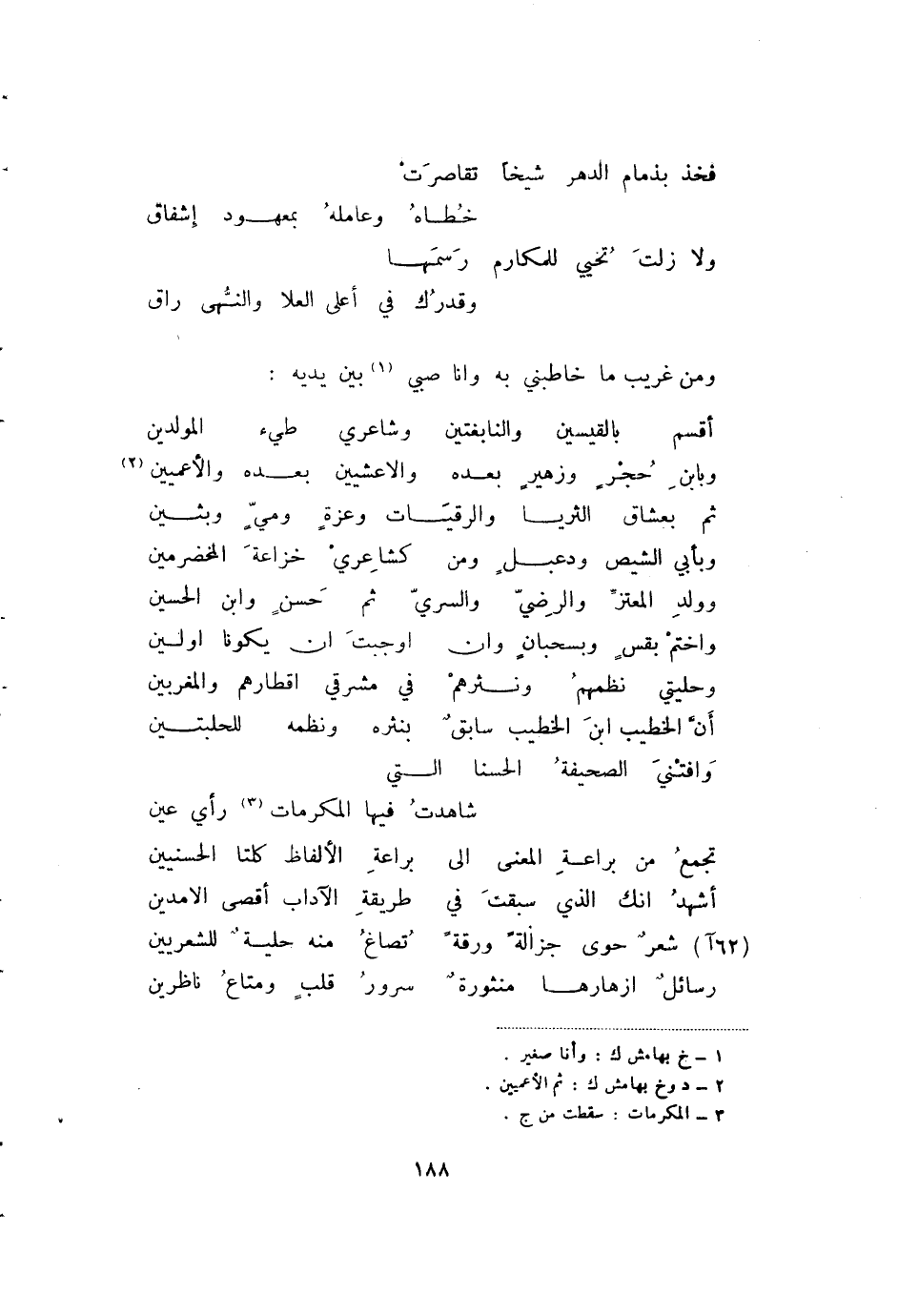 ولازلت تحيي للمكارم رسمها ... وقدرك في أعلى العلا والنهى راق ومن غريب ما خاطبني به وأنا صبي (1) بين يديه: