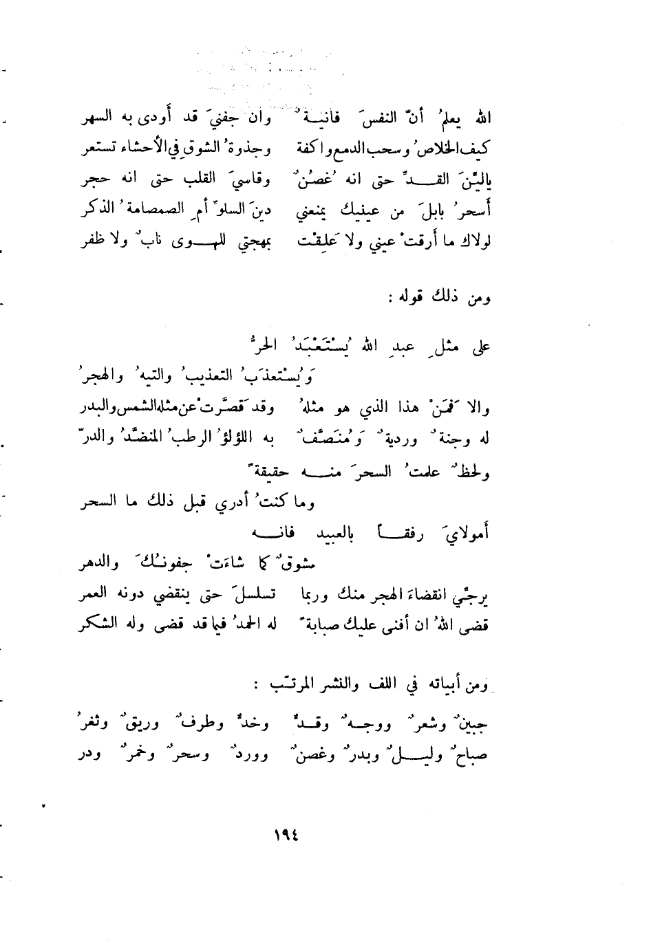 قضى الله إن أفنى عليك صبابة ... له الحمد فيما قد قضى وله الشكر ومن أبياته في اللف والنشر المرتب: