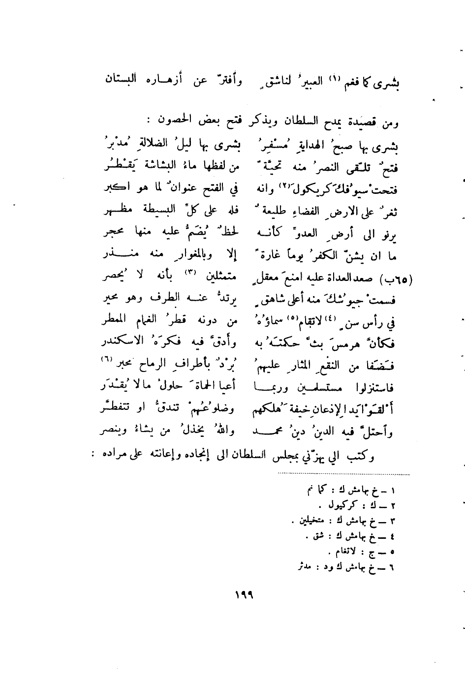 بشرى كما فغم (1) العبير لناشق ... وافتر عن أزهاره البستان ومن قصيدة يمدح السلطان ويذكر فتح بعض الحصون: