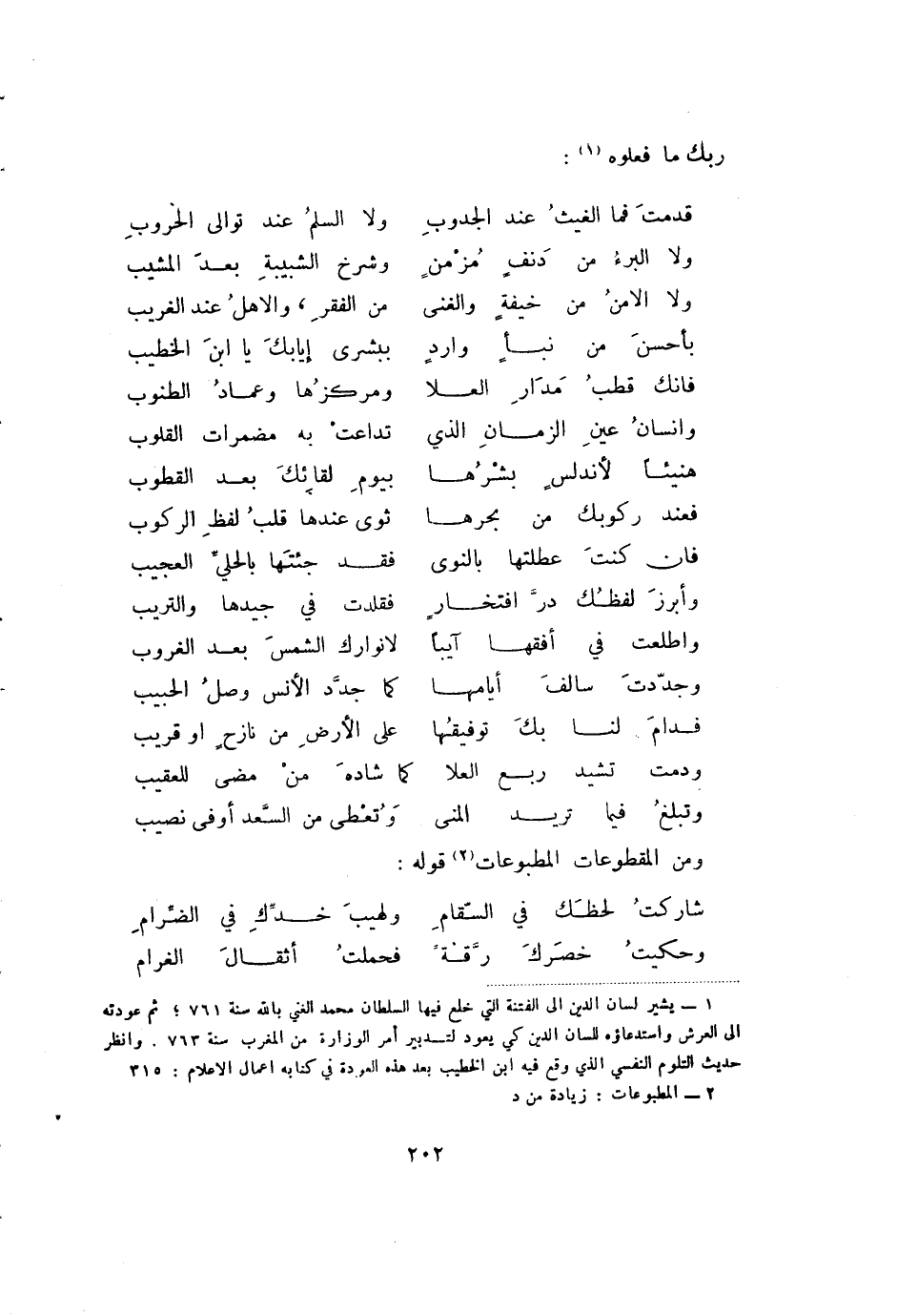 وتبلغ فيما تريد المنى ... وتعطى من السعد أوفى نصيب ومن المقطوعات المطبوعات (2) قوله:
