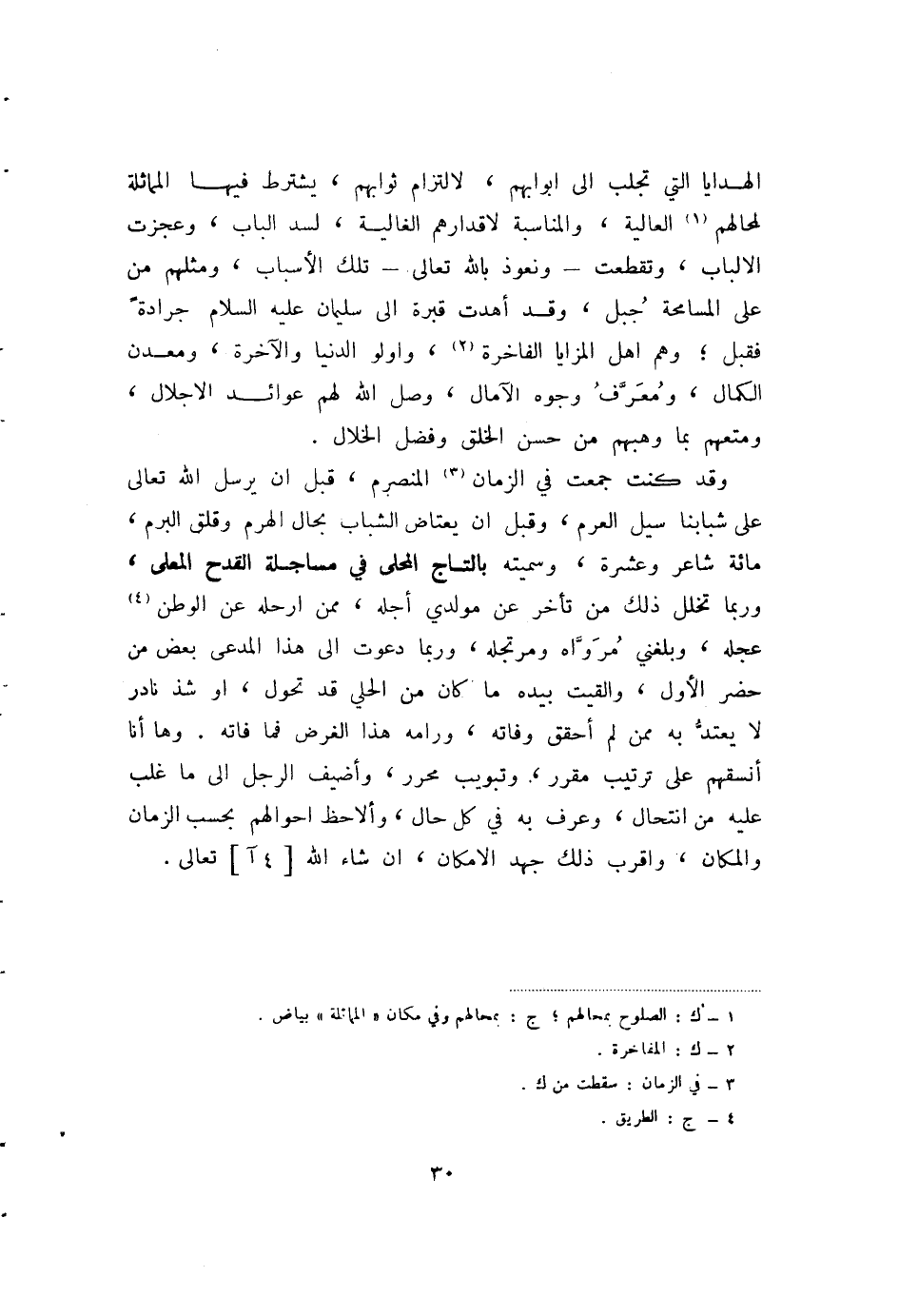 الهدايا التي تجلب إلى أبوابهم، لالتزام ثوابهم، يشترط فيها المماثلة لمحالهم (1) العالية، والمناسبة لأقدارهم الغالية، لسد الباب، وعجزت الالباب، وتقطعت؟ ونعوذ بالله تعالى؟ تلك الأسباب، ومثلهم على المسامحة جبل، وقد أهدت قبرة إلى سليمان عليه السلام جرادة فقبل، وهم أهل المزايا الفاخرة (2) ، وأولو الدنيا والآخرة، ومعدن الكمال، ومعرف وجوه الآمال، وصل الله لهم عوائد الاجلال، ومتعهم بما وهبهم من حسن الخلق وفضل الخلال.