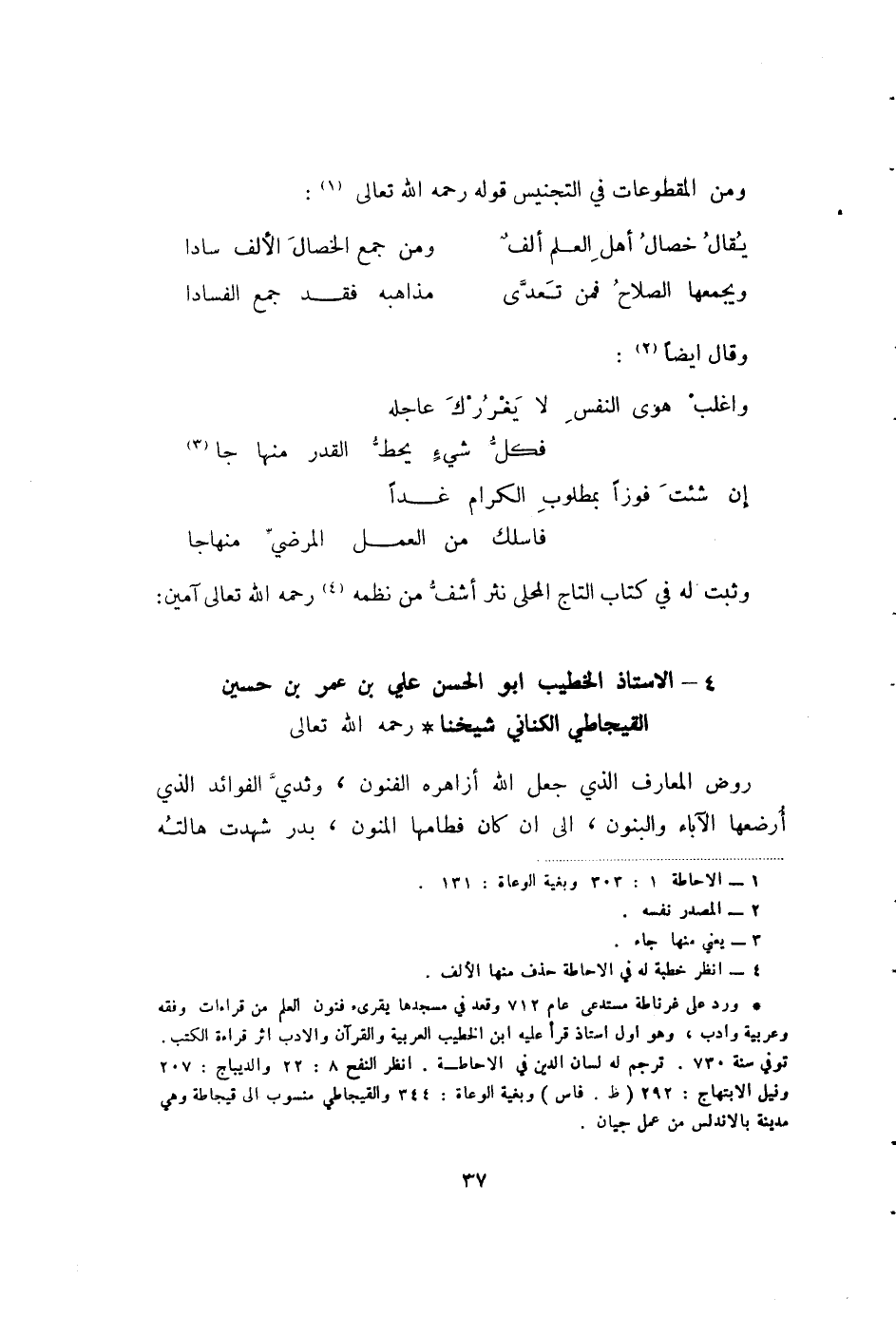 (5) ورد على غرناطة مستدعى عام 712 وقعد في مسجدها يقرئ فنون العلم من قراءات وفقه عربية وأدب، وهو أول أستاذ قرأ عليه ابن الخطيب العربية والقرآن والأدب اثر قراءة الكتب. توفي سنة 730. ترجم له لسان الدين في الإحاطة. انظر النفح 8: 22 والديباج 207 وليل الابتهاج: 292 (ط. فاس) وبغية الوعاة: 344 والقيجاطي منسوب إلى قيجاطة وهي مدينة بالأندلس من عمل جيان.