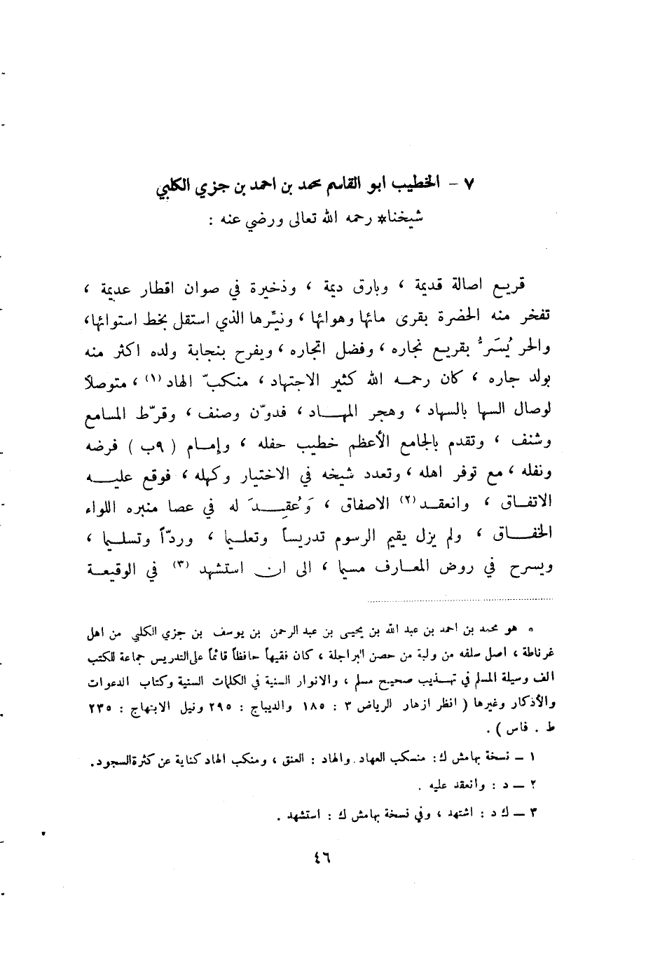 (1) هو محمد بن احمد بن عبد الله بن يحيى بن عبد الرحمن بن يوسف بن جزي الكلبي من اهل غرناطة، اصل سلفه من ولية من حصن البراجلة، كان فقيها حافظا قائما على التدريس جماعة للكتب الف وسيلة المسلم في تهذيب صحيح مسلم، والانوار السنية في الكلمات السنية وكتاب الدعوات والاذكار وغيرها (انظر ازهار الرياض 3: 185 والديباج: 295 ونيل الابتهاج: 235 ط. فاس.