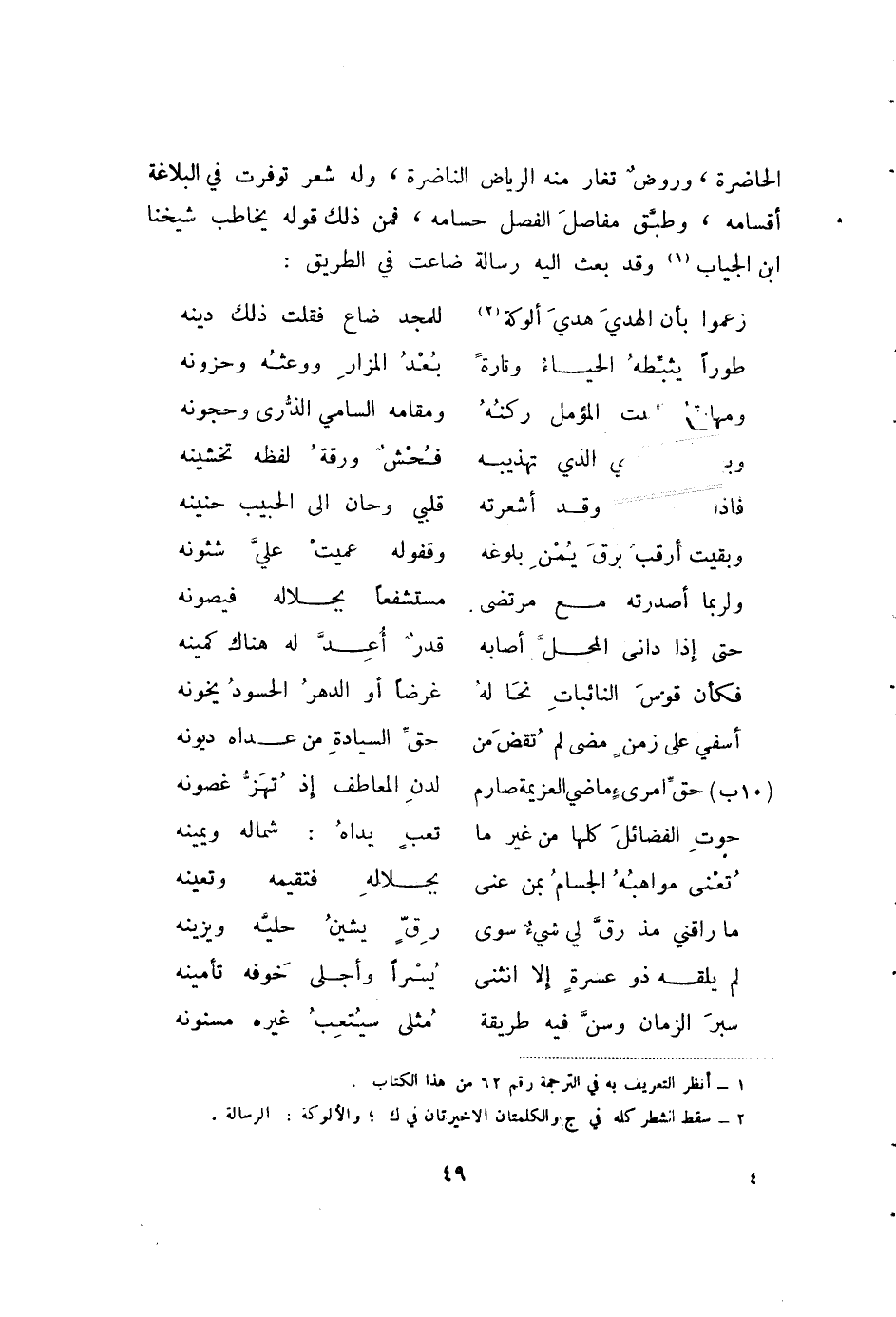 وروض تغار منه الرياض الناضرة، وله شعر في البلاغة أقسامه، وطبق مفاصل الفصل حسامه، فمن ذلك قوله يخاطب شيخنا ابن الجياب (1) وقد بعث إليه رسالة ضاعت في الطريق: