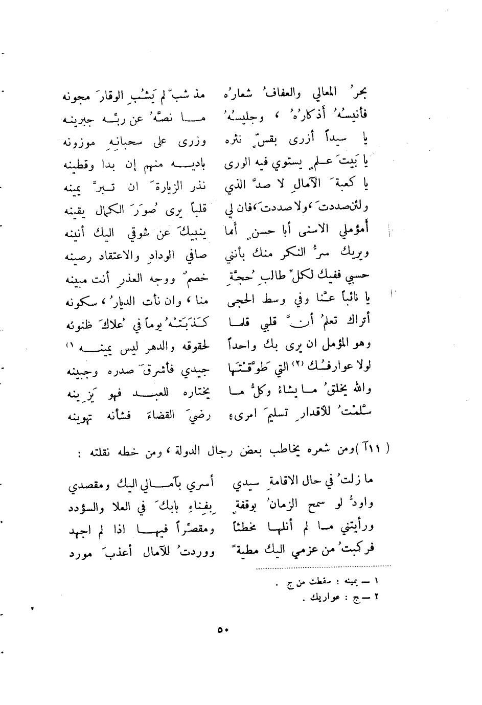 سلمت للأقدار تسليم امرئ ... رضي القضاء فشانه تهوينه (11آ) ومن شعره يخاطب بعض رجال الدولة، ومن خطه نقلته:
