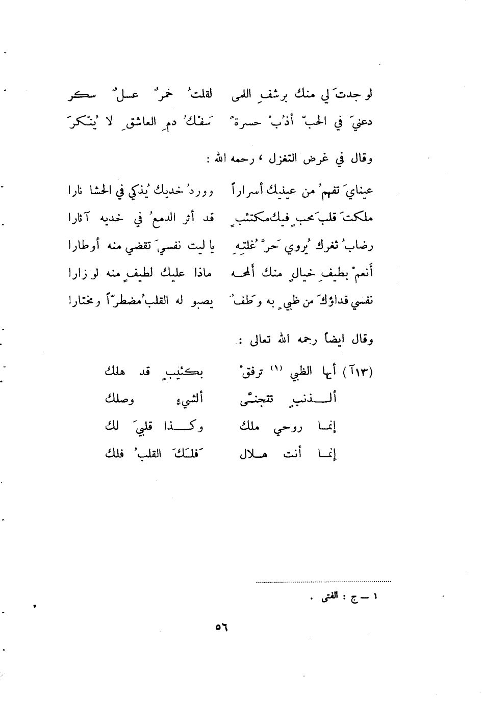 نفسي فداؤك من ظبي به وطف ... يصبو له القلب مضطرا أو مختارا وقال أيضا رحمه الله تعالى: