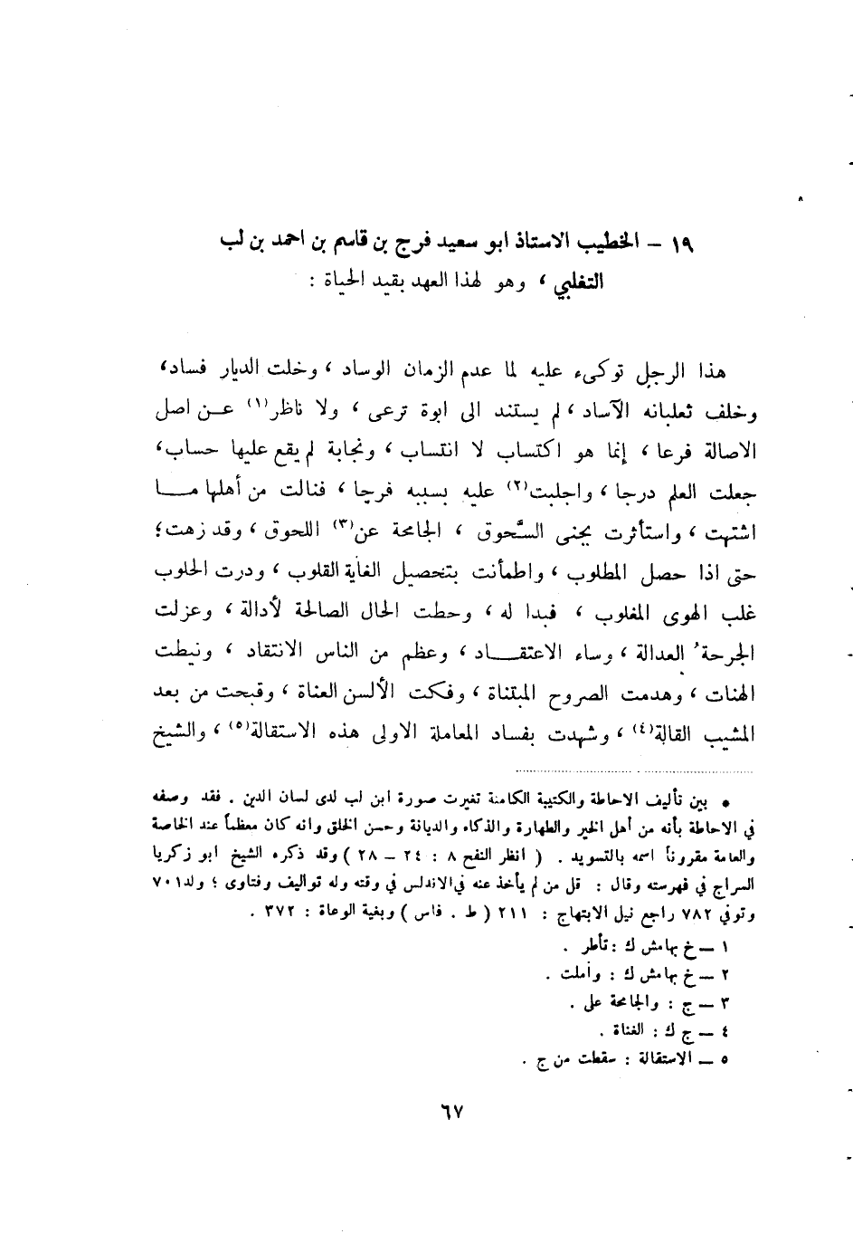 هذا الرجل توكئ عليه لما عدم الزمان الوساد، وخلت الديار فساد، وخلف ثعلبانه الاساد، لم يستند إلى ابوة ترعى، ولا ناظر (2) عن اصل الأصالة فرعا، انما هو اكتساب لا انتساب، ونجابة لم يقع عليها حساب، جعلت العلم درجا، واجبلت (3) عليه بسببه فرجا، فنالت من أهلها ما اشتهت، واستأثرت بجنى السحوق، الجامحة عن (4) اللحوق، وقد زهت، حتى إذا حصل المطلوب، واطمأنت بتحصيل الغاية القلوب، ودرت الحلوب غلب الهوى المغلوب، فبدا له، وحطت الحال الصالحة لادالة، وعزلت الجرحة العدالة، وساء الاعتقاد، وعظم من الناس الانتقاد، ونيطت الهنات، وهدمت الصروح المبتناة، وفكت الألسن العناة، وقبحت من بعد المشيب القالة (5) ، وشهدت بفساد المعاملة الأولى هذه الاستقالة (6) ، والشيخ