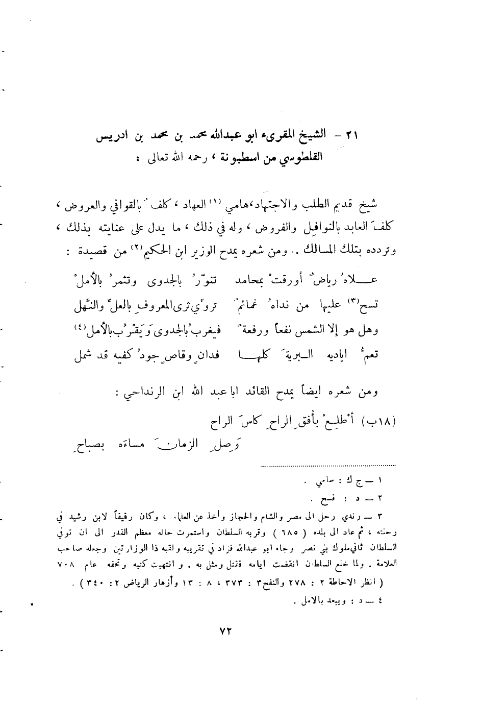 (3) رندي رحل إلى مصر والشام والحجاز واخذ عن العلماء، وكان رفيقا لابن الرشد في رحلته، ثم عاد إلى بلده (685) وقربه السلطان واستمرت حاله معظم القدر إلى أن توفي السلطان ثاني ملوك بني نصر وجاء أبو عبد الله فزاد في تقريبه ولقبه ذا الوزارتين وجعله صاحب العلامة. ولما خلع السلطان انقضت أيامه فقتل ومثل به. وانتهيت كتبه وتحفه عام (708) (انظر الإحاطة 2: 278. والنفح3: 373، 8: 13 وأزهار الرياض 2: 340.