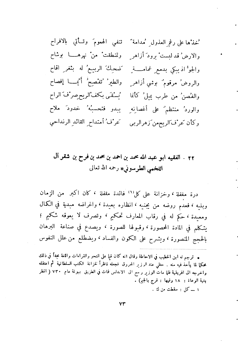 درة مغفلة، وخزانة على كل (2) فائدة مقفلة، كان اكبر من الزمان وبنيه، فعدم روضه من يجنيه، أنظاره بعيدة، وأغراضه مبدية في الكمال ومعيدة، حكم له في رقاب المعارف تحكيم، وتصرف لا يعوقه شكيم، يتكلم في المادة المحصورة، ويشرح على الكون والفساد، ويضطلع من علل النفوس