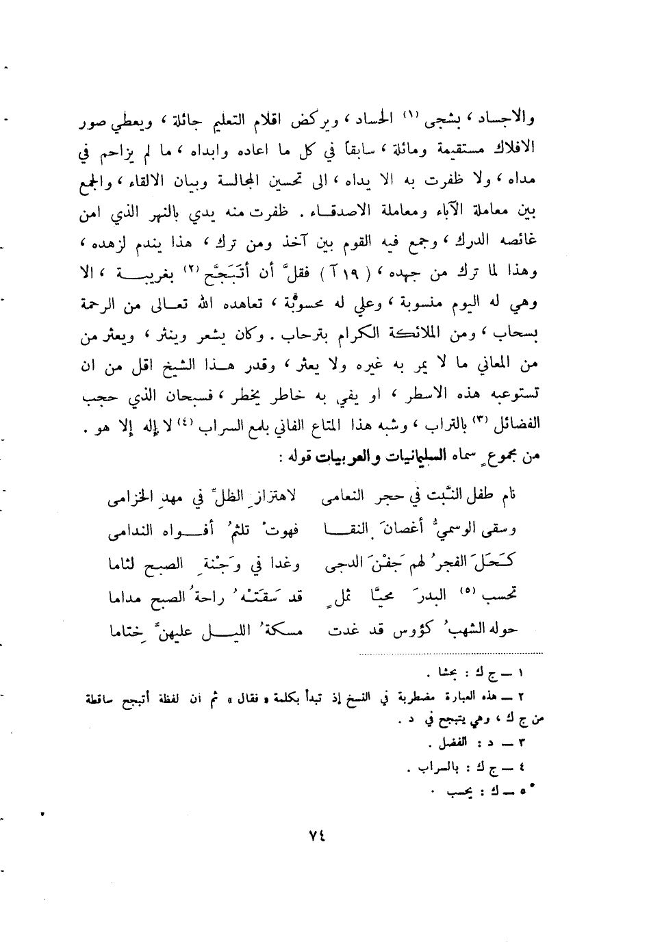والأجساد، بشجى (1) الحساد، ويركض أقلام التعليم جائلة، ويعطي صور الأفلاك مستقيمة ومائلة، سابقا في كل ما أعاده وأبداه، ما لم يزاحم في مداه، ولا ظفرت به ألا يداه، إلى تحسين المجالسة وبيان الإلقاء، والجمع بين معاملة الآباء ومعاملة الأصدقاء. ظفرت منه يدي بالنهر الذي أمن غائصة الدرك، وجمع فيه القوم بين آخذ ومن ترك، هذا يندم لزهده، وهذا لما ترك من جهده، (19آ) فقل أن أتبجح (2) بغريبة، إلا وهي له اليوم منسوبة، وعلي له محسوبة، تعاهده الله تعالى من الرحمة بسحاب، ومن الملائكة الكرام بترحاب. وكان يشعر وينثر، ويعثر من المعاني ما لا يمر به غيره ولا يعثر، وقدر هذا الشيخ اقل من ان تستوعبه هذه الأسطر، أو يفي به خاطر يخطر، فسبحان الذي حجب الفضائل (3) بالتراب، وشبه هذا المتاع الفاني بلمع السراب (4) لا اله إلا هو. من مجموع سماه السليمانيات والعربيات قوله: