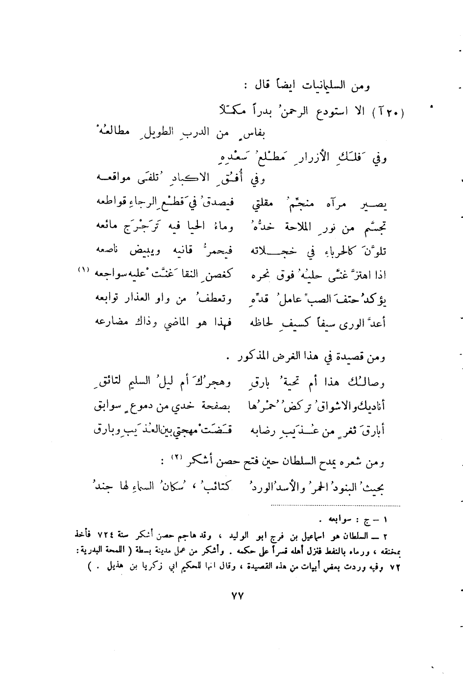(2) السلطان هو إسماعيل بن فرج أبو الوليد، وقد هاجم حصن اشك سنة 724 فاخذ بمخنقه، ورماه بالنفط فنزل اهله قسرا على حكمه. واشكر من عمل مدينة بسطة (اللمحة البدرية: 72 وفيه وردت بعض أبيات من هذه القصيدة، وقال إنها للحكيم أبي زكريا بن هذيل.)