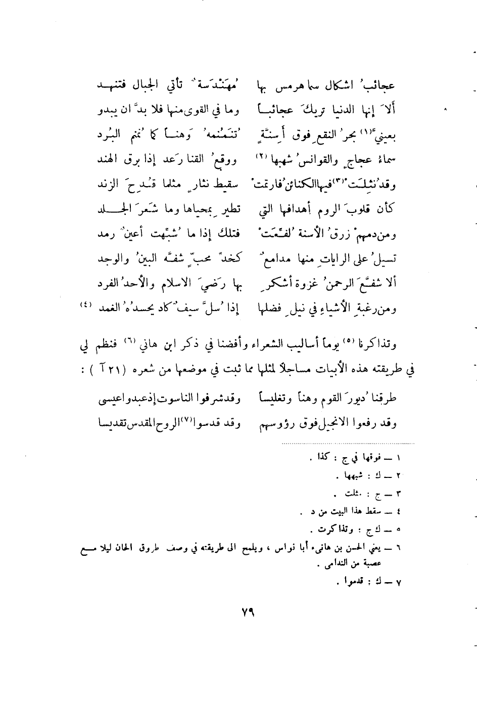 (6) يعني الحسن بن هانئ أبا نواس، ويلمح إلى طريقته في وصف طروق الحان ليلا مع عصبة من الندامى.