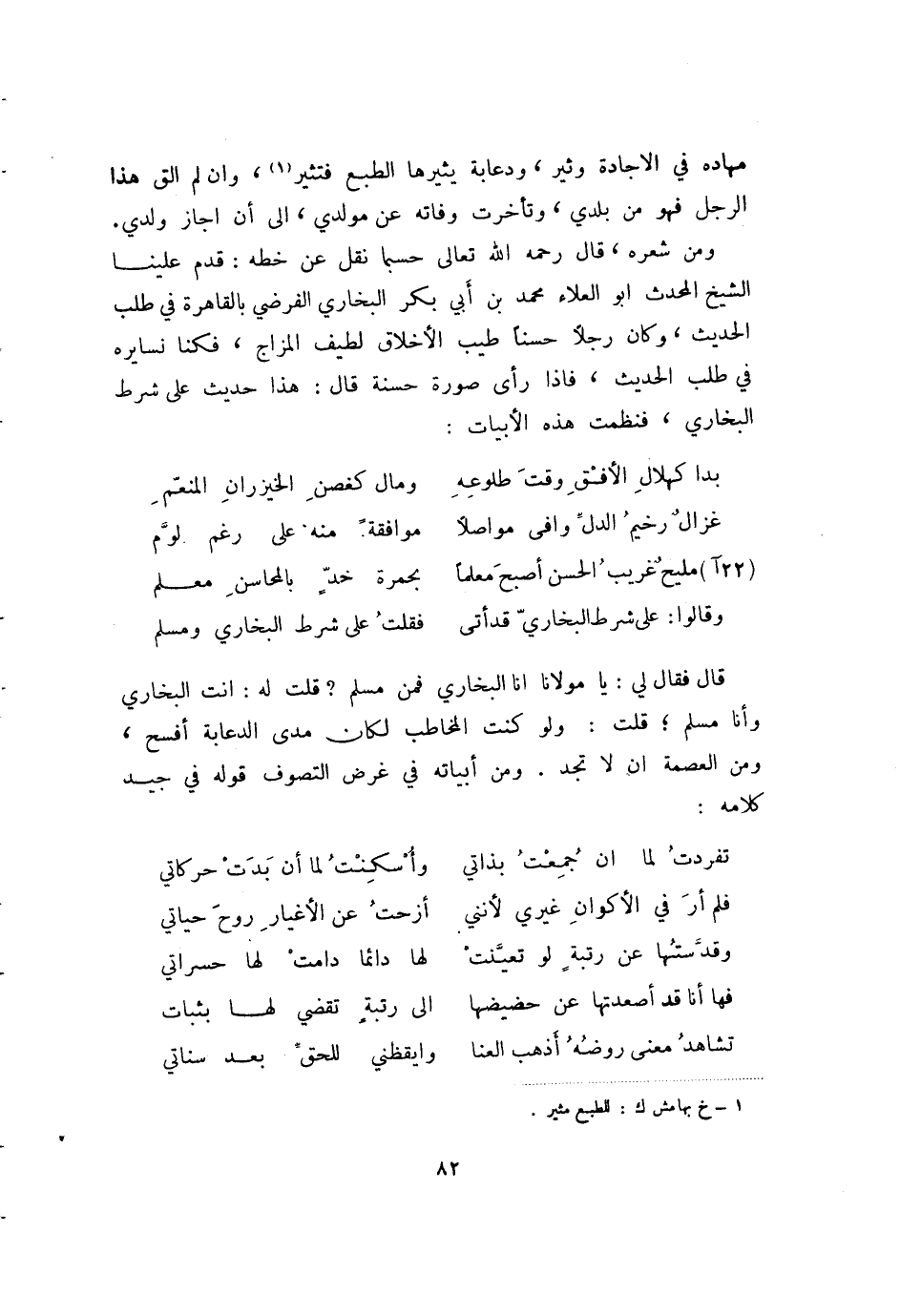 مهاده في الإجادة وثير، ودعابة يثيرها الطبع فتثير (1) ، وأن لم ألق هذا الرجل فهو من بلدي، وتأخرت وفاته عن مولدي، إلى أن أجاز ولدي. ومن شعره، قال رحمه الله تعالى حسبما نقل عن خطه: قدم علينا الشيخ المحدث أبو العلاء محمد بن أبي بكر البخاري الفرضي بالقاهرة في طلب الحديث، وكان رجلا حسنا طيب الأخلاق لطيف المزاج، فكنا نسايره في طلب الحديث، فإذا رأى صورة حسنة قال، هذا حديث على شرط البخاري، فنظمت هذه الأبيات: