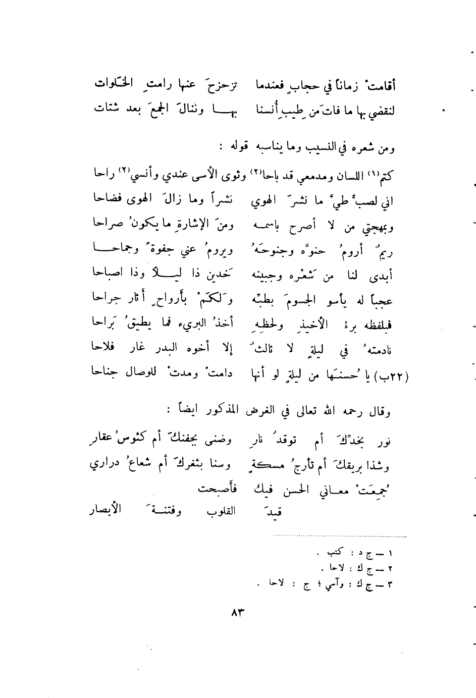 (22ب) يا حسنها من ليلة لو إنها ... دامت ومدت للوصال جناحا وقال رحمه الله تعالى في الغرض المذكور أيضا: