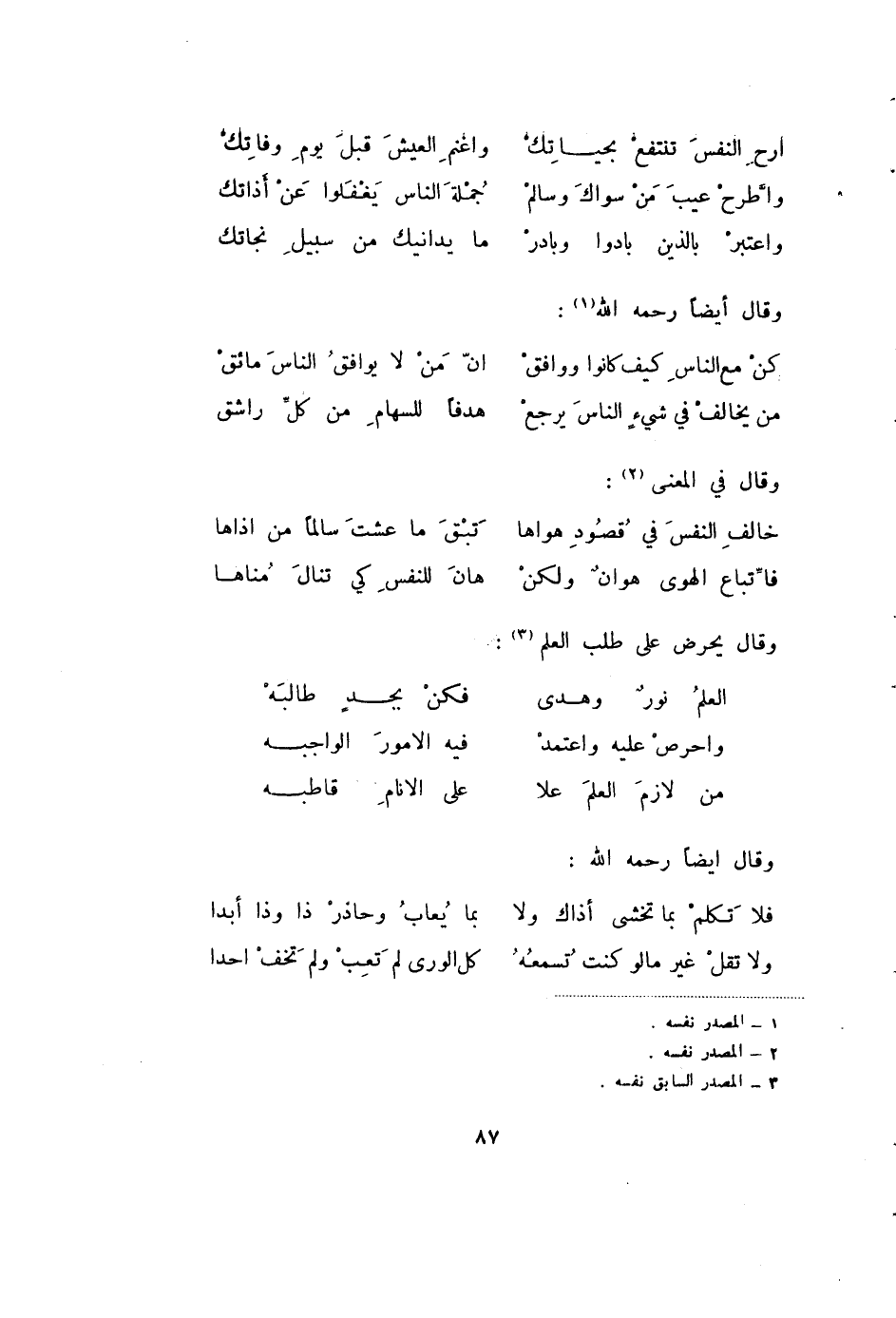فأتباع الهوى هوان ولكن ... هان للنفس كي تنال مناها وقال يحرض على طلب العلم (3) :