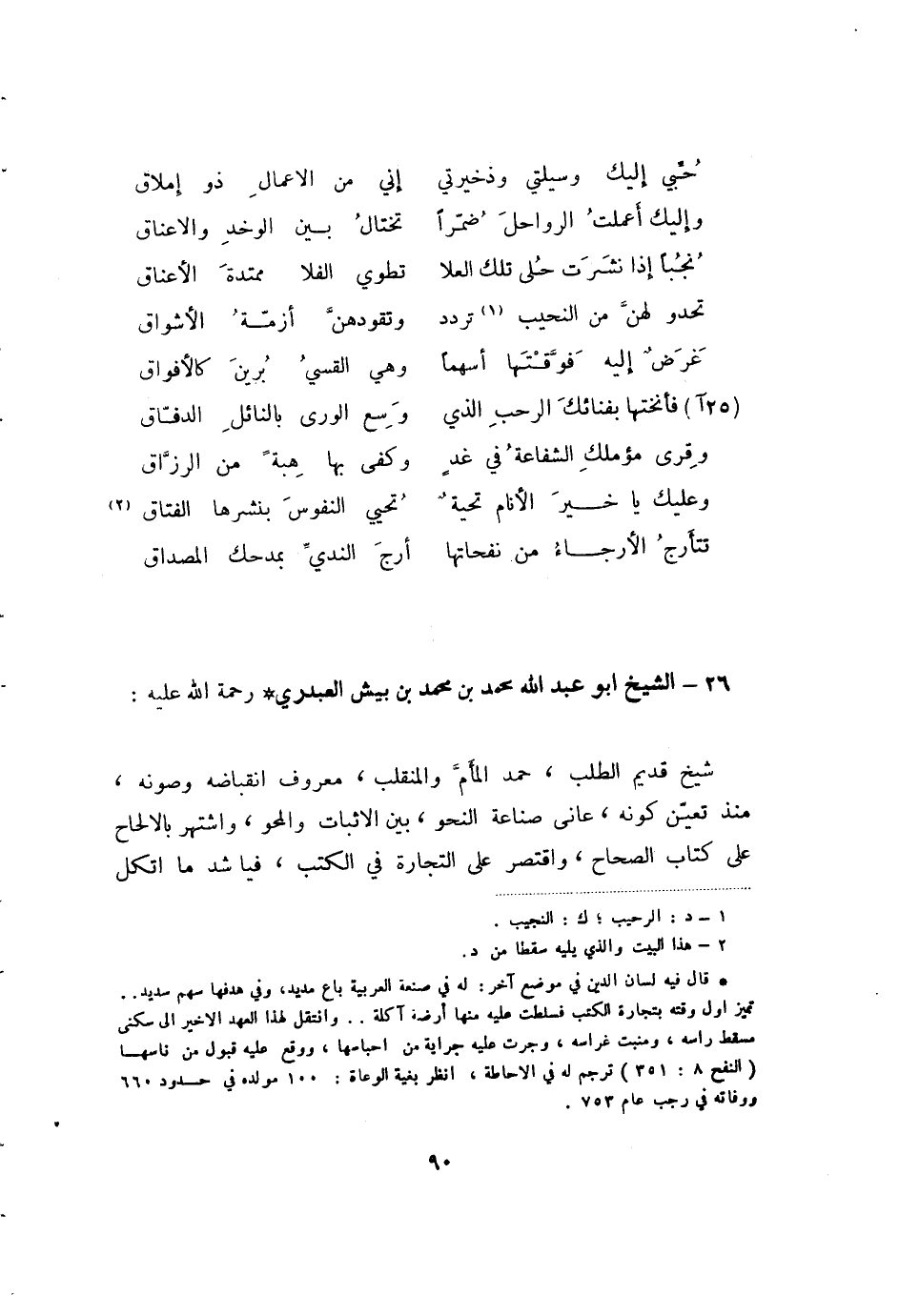 (3) قال فيه لسان الدين في موضع آخر: له في صنعة العربية باع مديد، وفي هدفها سهم سديد. تميز اول وقته بتجارة الكتب فسلطت عليه منها أرضة آكلة. وانتقل لهذا العهد الأخير إلى سكنى مسقط راسه، ومنبت غراسه، وجرت عليه جراية من احباسها، ووقع عليه قبول من ناسها (النفح 8: 351) ترجم له في الإحاطة، انظر بغية الوعاة: 100 مولده في حدود 660 ووفاته في رجب عام 753.