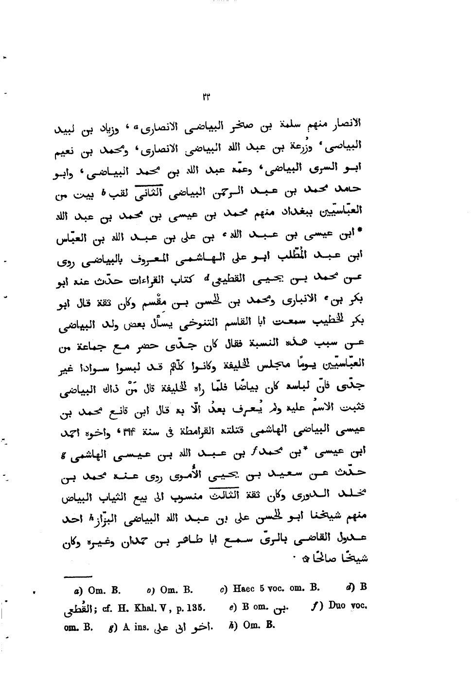 الأنصار منهم سلمة بن صخر البياضي الأنصاري، وزياد بن لبيد البياضي، وزرعة بن عبد الله البياضي الأنصاري، ومحمد بن نعيم أبو السري البياضي، وعمّه عبد الله بن محمد الباضي، وأبو حامد محمد بن عبد الرحمن البياضي الثاني لقب بيت من العَباسّيين ببغداد منهم محمد بن عيسى بن محمد بن عبد الله ابن عيسى ابن عبد الله بن علي بن عبد الله بن العبّاس ابن عبد المُطّلب أبو علي الهاشمي المعروف البياضي روى عن محمد بن يحيي الألقطيعي كتاب القراءات حدّث عنه أبو بكر بن الأنباري ومحمد بن الحسن بن مقْسم وكان ثقة قال أبو بكر الخطيب سمعت أبا القاسم التنوخي يسأل بعض ولد البياضي عن سبب هذه النسبة فقال كان جدّي حضر مع جماعة من العبّاسيّين يوماً مجلس الخليفة وكانوا كلّهم قد لبسوا سوادا غير جدّي فإنّ لباسه كان بياضا فلّما رآه االخليفة قال مّنْ ذاك البياضي فثبت الاسم عليه ولم يُعرف بعدُ إلاّ به قال ابن قانع محمد بن عيسى البياضي الهاشمي قتلته القرامطة في سنة 293، وأخوه احمد ابن عيسى بن محمد بن عبد الله بن عيسى الهاشمي حدّث عن سعيد بن يحيي الأموي روى عنه محمد بن مخلد الدوري وكان ثقة الثالث منسوب إلى بيع الثياب البياض منهم شيخنا أبو الحسن علي بن عبد الله البياضي البزّاز أحد عدول القاضي بالرّي سمع أبا طاهر بن حمان وغيره وكان شيخا صالحا.