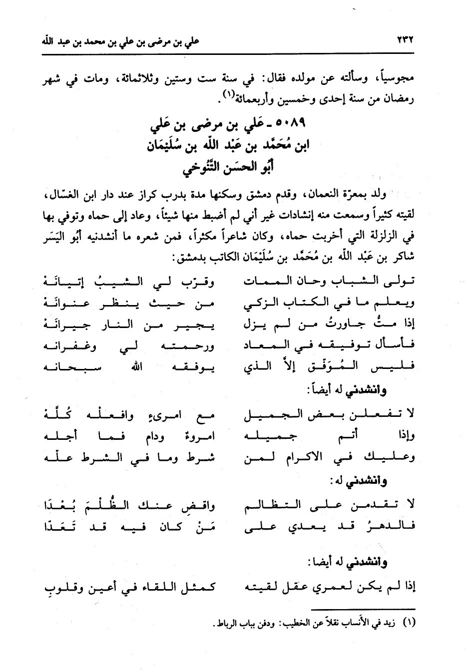 5089 - علي بن مرضى بن علي بن محمد بن عبد الله بن سليمان أبو الحسن التنوخي ولد بمعرة النعمان وقدم دمشق وسكنها مدة بدرب كراز عند دار ابن الغسال لقيته كثيرا وسمعت منه إنشادات غير أني لم أضبط منها شيئا وعاد إلى حماه وتوفي بها في الزلزلة التي أخربت حماه وكان شاعرا مكثرا فمن شعره ما أنشدنيه أو اليسر شاكر بن عبد الله بن محمد بن سليمان الكاتب بدمشق * تولى الشباب وحان الممات * وقرب لي الشيب إتيانه ويعلم ما في الكتاب الزكي * من حيث ينظر عنوانه إذا مت جاورت من لم يزل * يجير من النار جيرانه فأسأل توفيقه في المعاد * ورحمته لي وغفرانه فليس الموفق إلا الذي * يوفقه الله سبحانه * وأنشدني له أيضا * لا تفعلن بعض الجميل * مع امرئ وافعله كله وإذا أتم جميله * امروء ودام فما اجله وعليك في الإكرام لمن * شرط وما في الشرط عله * وأنشدني له * لا تقدمن على التظالم * واقض عنك الظلم بعدا فالدهر قد يعدي على * من كان فيه قد تعدا * وأنشدني له أيضا * إذا لم يكن لعمري عقل لقيته * كمثل اللقاء في أعين وقلوب