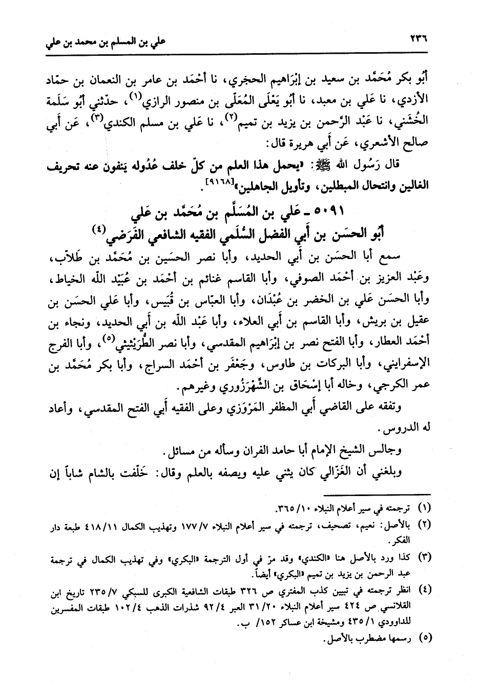 (4) انظر ترجمته في تبيين كذب المفتري ص 326 طبقات الشافعية الكبرى للسبكي 7 / 235 تاريخ ابن القلانسي ص 424 سير أعلام النبلاء 20 / 31 العبر 4 / 92 شذرات الذهب 4 / 102 طبقات المفسرين للداوودي 1 / 435 ومشيخة ابن عساكر 152 / ب