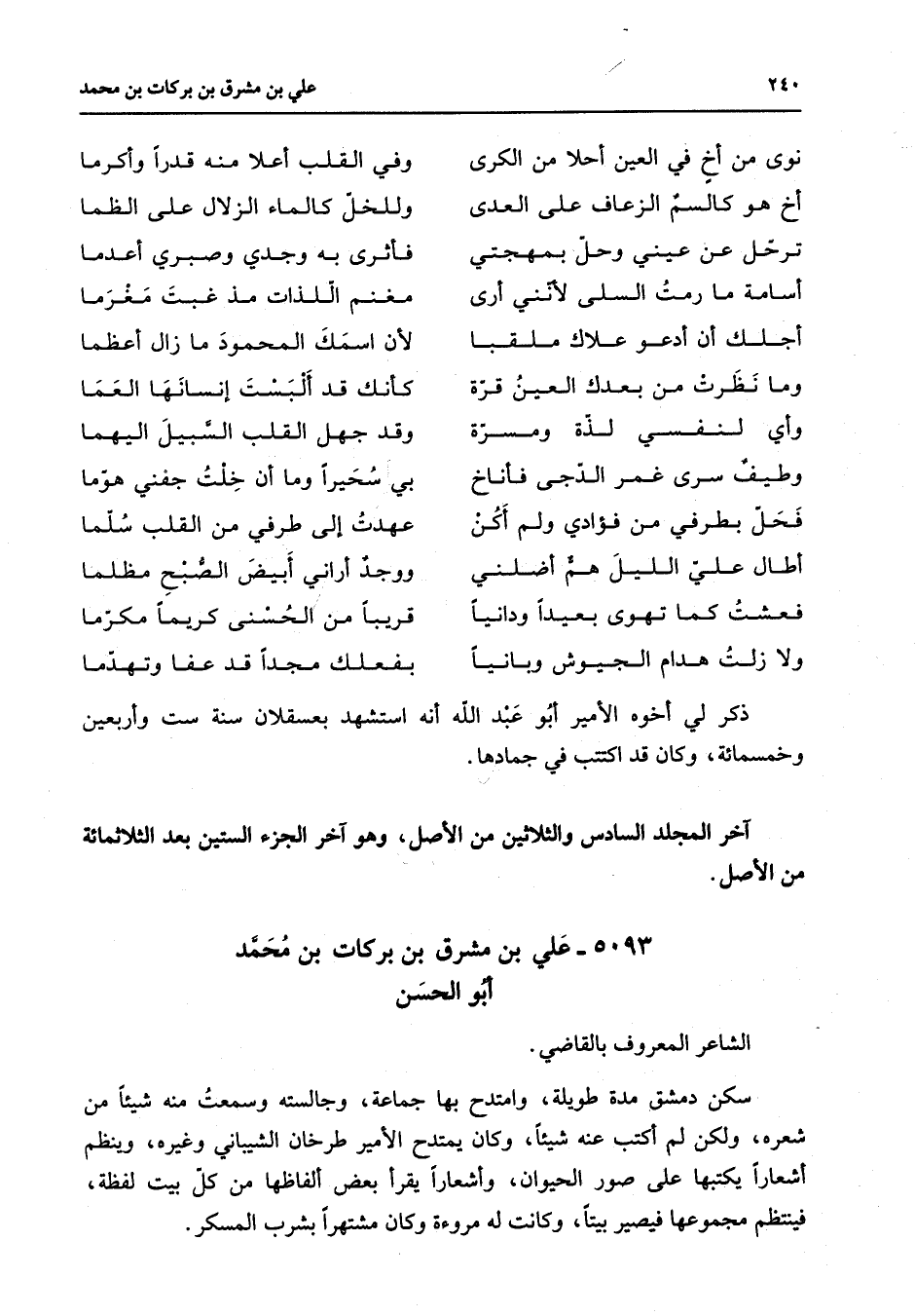 5093 - علي بن مشرق بن بركات بن محمد أبو الحسن الشاعر المعروف بالقاضي سكن دمشق مدة طويلة وامتدح بها جماعة وجالسته وسمعت منه شيئا من شعره ولكن لم أكتب عنه شيئا وكان يمتدح الأمير طرخان الشيباني وغيره وينظم أشعارا يكتبها على صور الحيوان وأشعارا يقرأ بعض ألفاظها من كل بيت لفظة فينتظم مجموعها فيصير بيتا وكانت له مروءة وكان مشتهرا بشرب المسكر