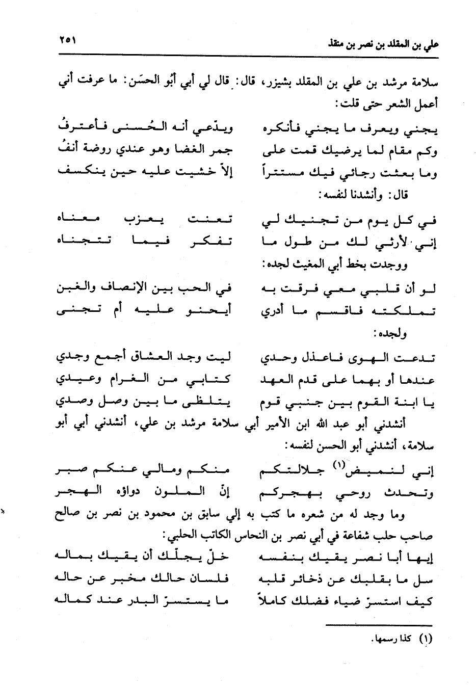 سلامة مرشد بن علي بن المقلد بشيزر قال قال لي أبي أبو الحسن ما عرفت أني أعمل الشعر حتى قلت * يجني ويعرف ما يجني فأنكره * ويدعي أنه الحسنى فأعترف وكم مقام لما يرضيك قمت على * جمرالغضا وهو عندي روضة أنف وما بعثت رجائي فيك مستترا * إلا خشيت عليه حين ينكسف * قال وأنشدنا لنفسه * في كل يوم من تجنيك لي * تعنت يعزب معناه إني لأرثي لك من طول ما * تفكر فيما تتجناه * ووجدت بخط أبي المغيث لجده * لو أن قلبي معي فرقت به * في الحب بين الإنصاف والغبن تملكته فاقسم ما أدري * أيحنو عليه أم تجنى * ولجده * تدعت الهوى فاعذل وحدي * ليت وجد العشاق أجمع وجدي عندها أو بهما على قدم العهد * كتابي من الغرام وعيدي يا ابنة القوم بين جنبي قوم * يتلظى ما بين وصل وصدي * أنشدني أبو عبد الله ابن الأمير أبي سلامة مرشد بن علي أنشدني أبي أبو سلامة أنشدني أبو الحسن لنفسه * إني لنميض (1) جلالتكم * منكم ومالي عنكم صبر وتحدث روحي بهجركم * إن الملون دواؤه الهجر * وما وجد له من شعره ما كتب به إلي سابق بن محمود بن نصر بن صالح صاحب حلب شفاعة في أبي نصر بن النحاس الكاتب الحلبي * إيها أبا نصر يقيك بنفسه * خل يجلك أن يقيك بماله سل ما بقلبك عن ذخائر قلبه * فلسان حالك مخبر عن حاله كيف استسر ضياء فضلك كاملا * ما يستسر البدر عند كماله