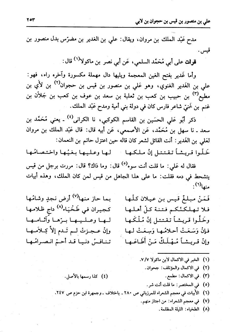 مدح عبد الملك بن مروان ويقال علي بن الغدير بن مضرس بدل منصور بن قيس قرأت على أبي محمد السلمي عن أبي نصر بن ماكولا (1) قال وأما غدير بفتح الغين المعجمة ويليها دال مهملة مكسورة وآخره راء فهو علي بن الغدير الغنوي وهو علي بن منصور بن قيس بن حجوان (2) بن لأي بن مطيع (3) بن حبيب بن كعب بن ثعلبة بن سعد بن عوف بن كعب بن جلان بن غنم بن غني شاعر فارس كان في دولة بني أمية ومدح عبد الملك ذكر أبو علي الحسين بن القاسم الكوكبي نا الكراني (4) يعني محمد بن سعد نا سهل بن محمد عن الأصمعي عن أبيه قال قال عبد الملك بن مروان لعلي بن الغدير أنت القائل لشعر كان قاله حين اعتزل حاتم بن النعمان * خلوا قريشا تقتتل إن ملكها * لها وعليها بغيها واختصامها * فقال له علي ما قلت أنت سوء (5) قال وما ذاك قال مررت برجل من قيس يتشحط في دمه فقلت ما على هذا الجاهل من قيس لمن كان الملك وهذه أبيات منها (6) * فمن مبلغ قيس بن عيلان كلها * بما حاز منها (7) أرض نجد وشامها فلا تهلكنكم فتنة كل أهلها * كجيران في طخياء (8) داج ظلامها وخلوا قريشا تقتتل إن ملكها * لها وعليها برها وآثامها فإن وسعت أحلامها وسعت لها * وإن عجزت لم تدم إلا كلامها وإن قريشا مهلك من أطاعها * تنافس دنيا قد أحم انصرامها *