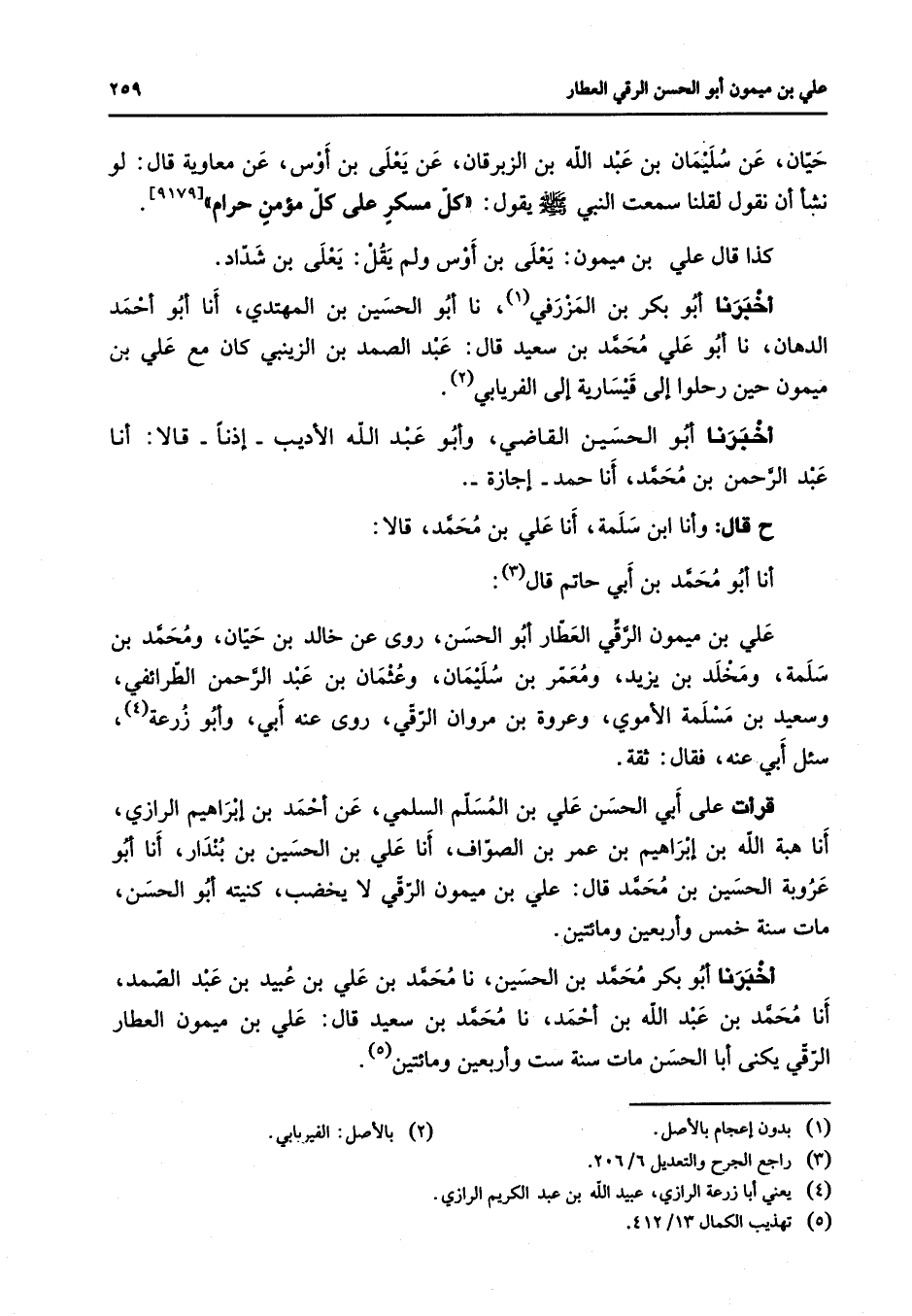حيان عن سليمان بن عبد الله بن الزبرقان عن يعلى بن أوس عن معاوية قال لو نشأ أن نقول لقلنا سمعت النبي (صلى الله عليه وسلم) يقول كل مسكر على كل مؤمن حرام كذا قال علي بن ميمون يعلى بن أوس ولم يقل يعلى بن شداد أخبرنا أبو بكر بن المزرفي (1) نا أبو الحسين بن المهتدي أنا أبو أحمد الدهان نا أبو علي محمد بن سعيد قال عبد الصمد بن الزينبي كان مع علي بن ميمون حين رحلوا إلى قيسارية إلى الفريابي (2) أخبرنا أبو الحسين القاضي وأبو عبد الله الأديب إذنا قالا أنا عبد الرحمن بن محمد أنا حمد إجازة ح قال وأنا ابن سلمة أنا علي بن محمد قالا أنا أبو محمد بن أبي حاتم قال (3) علي بن ميمون الرقي العطار أبو الحسن روى عن خالد بن حيان ومحمد بن سلمة ومخلد بن يزيد ومعمر بن سليمان وعثمان بن عبد الرحمن الطرائفي وسعيد بن مسلمة الأموي وعروة بن مروان الرقي روى عنه أبي وأبو زرعة (4) سئل أبي عنه فقال ثقة قرأت على أبي الحسن علي بن المسلم السلمي عن أحمد بن إبراهيم الرازي أنا هبة الله بن إبراهيم بن عمر بن الصواف أنا علي بن الحسين بن بندار أنا أبو عروبة الحسين بن محمد قال علي بن ميمون الرقي لا يخضب كنيته أبو الحسن مات سنة خمس وأربعين ومائتين أخبرنا أبو بكر محمد بن الحسين نا محمد بن علي بن عبيد بن عبد الصمد أنا محمد بن عبد الله بن أحمد نا محمد بن سعيد قال علي بن ميمون العطار الرقي يكنى أبا الحسن مات سنة ست وأربعين ومائتين (5)