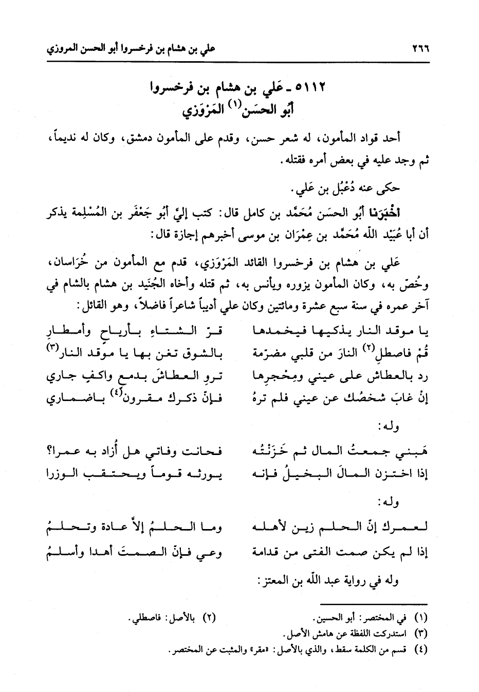 5112 - علي بن هشام بن فرخسروا أبو الحسن (1) المروزي أحد قواد المأمون له شعر حسن وقدم على المأمون دمشق وكان له نديما ثم وجد عليه في بعض أمره فقتله حكى عنه دعبل بن علي أخبرنا أبو الحسن محمد بن كامل قال كتب إلي أبو جعفر بن المسلمة يذكر أن أبا عبيد الله محمد بن عمران بن موسى أخبرهم إجازة قال علي بن هشام بن فرخسروا القائد المروزي قدم مع المأمون من خراسان وخص به وكان المأمون يزوره ويأنس به ثم قتله وأخاه الجنيد بن هشام بالشام في آخر عمره في سنة سبع عشرة ومائتين وكان علي أديبا شاعرا فاضلا وهو القائل * يا موقد النار يذكيها فيخمدها * قر الشتاء بأرياح وأمطار * * قم فاصطل (2) النار من قلبي مضرمة * بالشوق تغن بها يا موقد النار (3) رد بالعطاش على عيني ومحجرها * ترو العطاش بدمع واكف جاري * * إن غاب شخصك عن عيني فلم تره * فإن ذكرك مقرون (4) باضماري * وله * هبني جمعت المال ثم خزنته * فحانت وفاتي هل ازاد به عمرا إذا اختزن المال البخيل فإنه * يورثه قوما ويحتقب الوزرا * وله * لعمرك إن الحلم زين لأهله * وما الحلم إلا عادة وتحلم إذا لم يكن صمت الفتى من قدامة * وعي فإن الصمت أهدا وأسلم * وله في رواية عبد الله بن المعتز