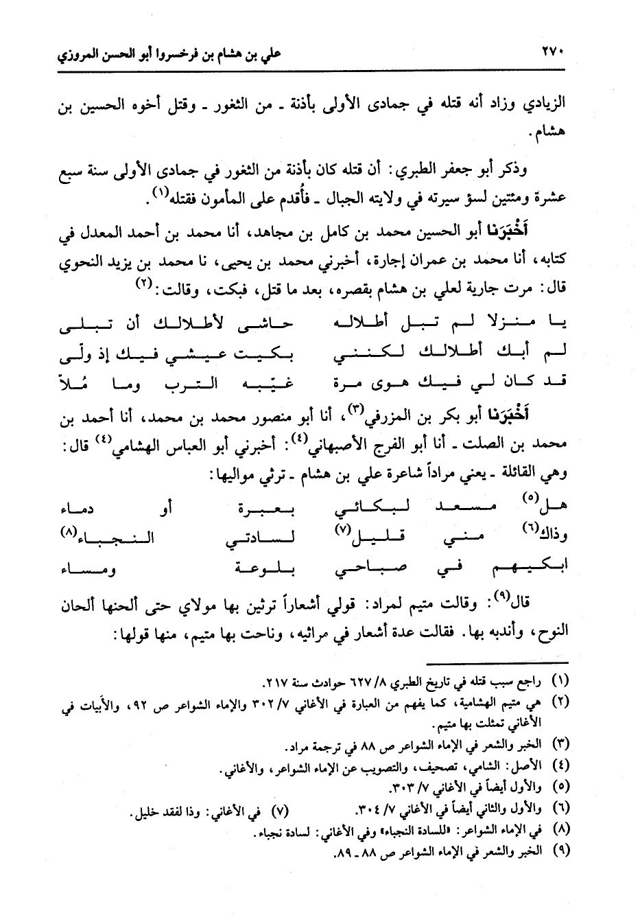 الزيادي وزاد أنه قتله في جمادى الأولى بأذنة من الثغور وقتل أخوه الحسين بن هشام وذكر أبو جعفر الطبري أن قتله كان بأذنة من الثغور في جمادى الأولى سنة سبع عشرة ومئتين لسوء سيرته في ولايته الجبال فأقدم على المأمون فقتله (1) أخبرنا أبو الحسين محمد بن كامل بن مجاهد أنا محمد بن أحمد المعدل في كتابه أنا محمد بن عمران إجارة أخبرني محمد بن يحيى نا محمد بن يزيد النحوي قال مرت جارية لعلي بن هشام بقصره بعد ما قتل فبكت وقالت (2) * يا منزلا لم تبل أطلاله * حاشى لأطلالك أن تبلى لم أبك أطلالك لكنني * بكيت عيشي فيك إذ ولى قد كان لي فيك هوى مرة * غيبه الترب وما ملا * أخبرنا أبو بكر بن المزرفي (3) أنا أبو منصور محمد بن محمد أنا أحمد بن محمد بن الصلت أنا أبو الفرج الأصبهاني (4) أخبرني أبو العباس الهشامي (4) قال وهي القائلة يعني مرادا شاعرة علي بن هشام ترثي مواليها * هل (5) مسعد لبكائي * بعبرة أو دماء وذاك (6) مني قليل (7) * لسادتي النجباء (8) ابكيهم في صباحي * بلوعة ومساء * قال (9) وقالت متيم لمراد قولي أشعارا ترثين بها مولاي حتى ألحنها ألحان النوح وأندبه بها فقالت عدة أشعار في مراثيه وناحت بها متيم منها قولها