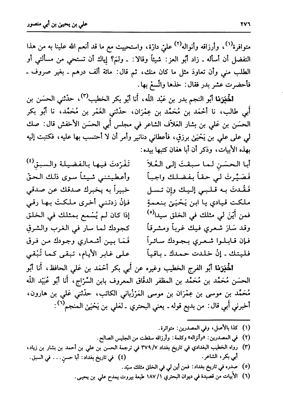 متوافرة (1) وأرزاقه وأنواله (2) علي دارة واستحييت مع ما قد أنعم الله علينا به من هذا التفضل أن أسأله زاد أبو العز شيئا وقالا ولم إياك أن تستحي من مسألتي أو الطلب مني وأن تعاود مثل ما كان منك ثم قال مائة ألف درهم بغير صروف فأحضرت عشر بدر فقال خذها واتسع بها أخبرنا أبو النجم بدر بن عبد الله أنا أبو بكر الخطيب (3) حدثني الحسن بن أبي طالب نا أحمد بن محمد بن عمران حدثني الغمر بن محمد نا أبو بكر الحسن بن علي بن بشار العلاف الشاعر في مجلس أبي الحسن الأخفش قال صك لي على علي بن يحيى برزق فأعطاني دنانير وأمر أن لا أحتسب بها عليه فكتبت إليه بهذه الأبيات وذكر أن أبا هفان كتبها بيده * أبا الحسن لما سبقت إلى العلا * تفردت فيها بالفضيلة والسبق (4) فصيرت لي حقا بفضلك واجبا * وأعطيتني شيئا سوى ذلك الحق فقدت به قلبي إليك وإن تسل * خبيرا به يخبرك صدقك عن صدق ملكت قيادي يا ابن يحيى بنعمة * فإن زدتني أخرى ملكت بها رقي فمن أين لي مثلك في الخلق سيدا (5) * إذا كان لم يسمع بمثلك في الخلق وقد سار شعري فيك غربا ومشرقا * كجودك لما سار في الغرب والشرق فإن قابلوا شعري بجودك سائرا * فما بين أشعاري وجودك من فرق فليتك إن خلدت حمدك باقيا * على غابر الأيام تبقى كما تبقي * أخبرنا أبو الفرج الخطيب وغيره عن أبي بكر أحمد بن علي الحافظ أنا أبو الحسن محمد بن محمد بن المظفر الدقاق المعروف بابن السراج أنا أبو عبيد الله محمد بن موسى بن عمران بن موسى المرزباني الكاتب حدثني علي بن هارون أخبرني أبي قال من بديع قوله يعني البحتري لعلي بن يحيى المنجم (6)