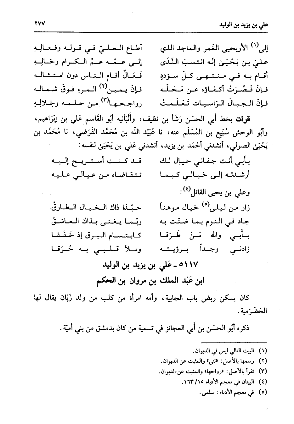 5117 - علي بن يزيد بن الوليد بن عبد الملك بن مروان بن الحكم كان يسكن ربض باب الجابية وأمه امرأة من كلب من ولد زبان يقال لها الحضرمية ذكره أبو الحسن بن أبي العجائز في تسمية من كان بدمشق من بني أمية