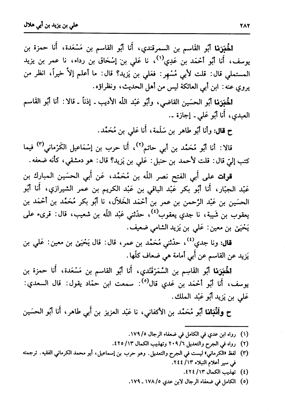 أخبرنا أبو القاسم بن السمرقندي أنا أبو القاسم بن مسعدة أنا حمزة بن يوسف أنا أبو أحمد بن عدي (1) نا علي بن إسحاق بن رداء نا عمر بن يزيد المستملي قال قلت لأبي مسهر فعلي بن يزيد قال ما أعلم إلا خيرا انظر من يروي عنه ابن أبي العاتكة ليس من أهل الحديث ونظراؤه أخبرنا أبو الحسين القاضي وأبو عبد الله الأديب إذنا قالا أنا أبو القاسم العبدي أنا أبو علي إجازة ح قال وأنا أبو طاهر بن سلمة أنا علي بن محمد قالا أنا أبو محمد بن أبي حاتم (2) أنا حرب بن إسماعيل الكرماني (3) فيما كتب إلي قال قلت لأحمد بن حنبل علي بن يزيد قال هو دمشقي كأنه ضعفه قرأت على أبي الفتح نصر الله بن محمد عن أبي الحسين المبارك بن عبد الجبار أنا أبو بكر عبد الباقي بن عبد الكريم بن عمر الشيرازي أنا أبو الحسين بن عبد الرحمن بن عمر بن أحمد الخلال نا أبو بكر محمد بن أحمد بن يعقوب بن شيبة نا جدي يعقوب (4) حدثني عبد الله بن شعيب قال قرئ على يحيى بن معين علي بن يزيد الشامي ضعيف قال ونا جدي (4) حدثني محمد بن عمر قال قال يحيى بن معين علي بن بن يزيد عن القاسم عن أبي أمامة هي ضعاف كلها أخبرنا أبو القاسم بن السمرقندي أنا أبو القاسم بن مسعدة أنا حمزة بن يوسف أنا أبو أحمد بن عدي قال (5) سمعت ابن حماد يقول قال السعدي علي بن يزيد أبو عبد الملك ح وأنبأنا أبو محمد بن الأكفاني نا عبد العزيز بن أبي طاهر أنا أبو الحسين