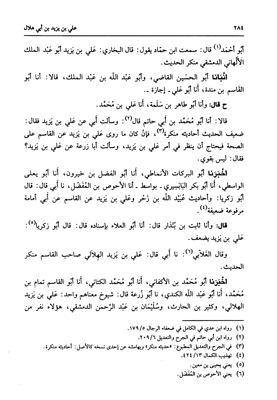 أبو أحمد (1) قال سمعت ابن حماد يقول قال البخاري علي بن يزيد أبو عبد الملك الألهاني الدمشقي منكر الحديث أنبأنا أبو الحسين القاضي وأبو عبد الله بن عبد الملك قالا أنا أبو القاسم بن مندة أنا أبو علي إجازة ح قال وأنا أبو طاهر بن سلمة أنا علي بن محمد قالا أنا أبو محمد بن أبي حاتم قال (2) وسألت أبي عن علي بن يزيد فقال ضعيف الحديث أحاديثه منكرة (3) فإن كان ما روى علي بن يزيد عن القاسم على الصحة فيحتاج أن ينظر في أمر علي بن يزيد وسألت أبا زرعة عن علي بن يزيد فقال ليس بقوي أخبرنا أبو البركات الأنماطي أنا أبو الفضل بن خيرون أنا أبو يعلى الواسطي أنا أبو بكر البابسيري بواسط أنا الأحوص بن المفضل نا أبي قال قال أبو زكريا وأحاديث عبيد الله بن زحر وعلي بن يزيد عن القاسم عن أبي أمامة مرفوعة ضعيفة (4) قال وأنا ثابت بن بندار قال أنا أبو العلاء بإسناده قال قال أبو زكريا (5) علي بن يزيد يضعف وقال الغلابي (6) نا أبي قال علي بن يزيد الهلالي صاحب القاسم منكر الحديث أخبرنا أبو محمد بن الأكفاني أنا أبو محمد الكتاني أنا أبو القاسم تمام بن محمد أنا أبو عبد الله الكندي نا أبو زرعة قال شيوخ معناهم واحد علي بن يزيد الهلالي وكثير بن الحارث وسليمان بن عبد الرحمن الدمشقي هؤلاء نفر من