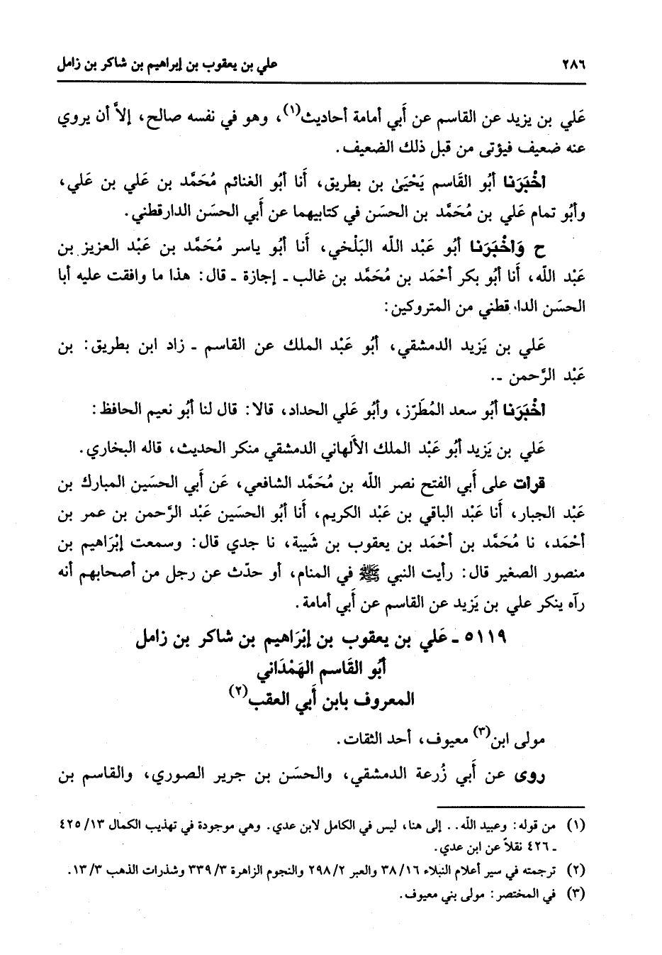 5119 - علي بن يعقوب بن إبراهيم بن شاكر بن زامل أبو القاسم الهمداني المعروف بابن أبي العقب (2) مولى ابن (3) معيوف أحد الثقات روى عن أبي زرعة الدمشقي والحسن بن جرير الصوري والقاسم بن