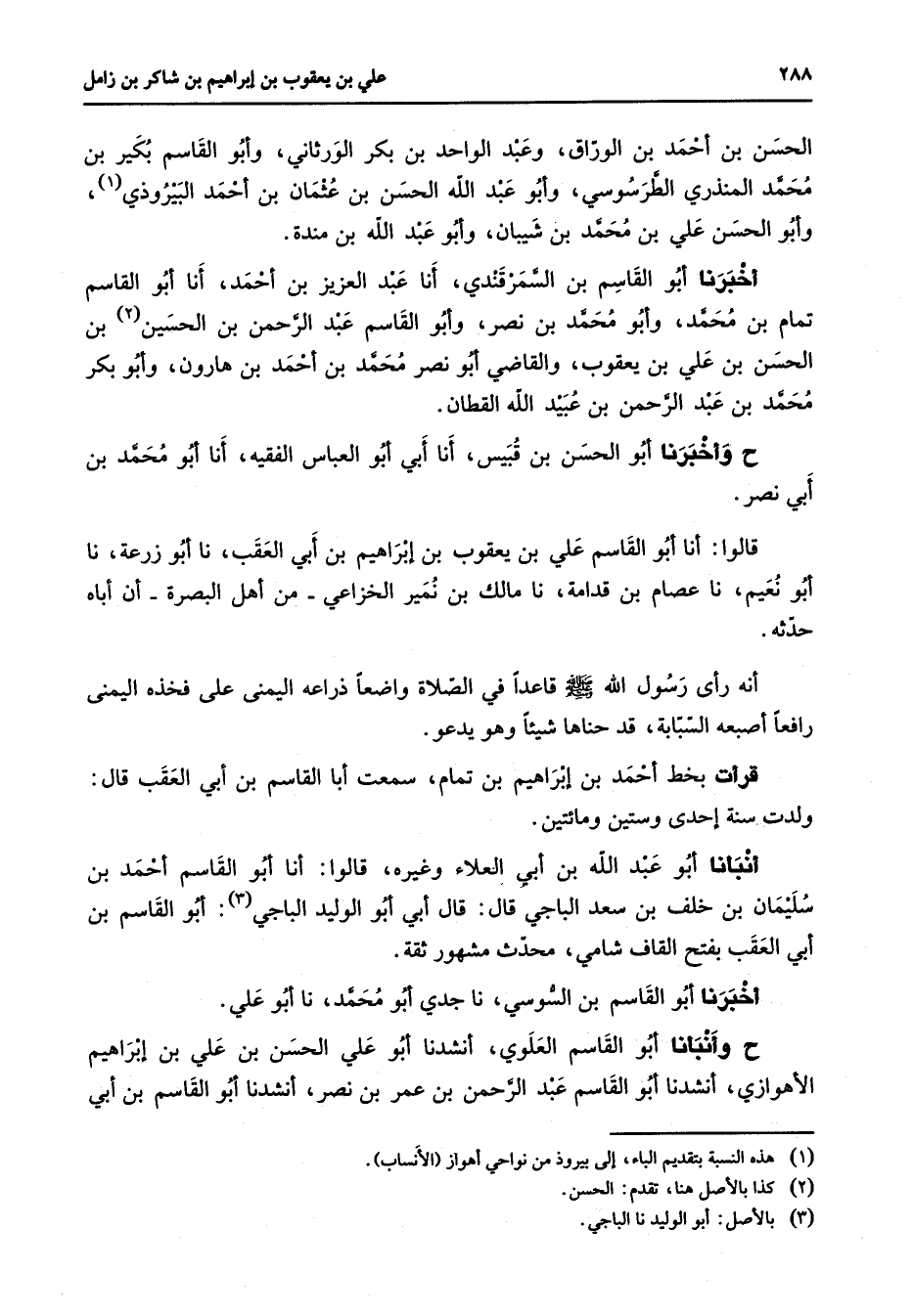 الحسن بن أحمد بن الوراق وعبد الواحد بن بكر الورثاني وأبو القاسم بكير بن محمد المنذري الطرسوسي وأبو عبد الله الحسن بن عثمان بن أحمد البيروذي (1) وأبو الحسن علي بن محمد بن شيبان وأبو عبد الله بن مندة أخبرنا أبو القاسم بن السمرقندي أنا عبد العزيز بن أحمد أنا أبو القاسم تمام بن محمد وأبو محمد بن نصر وأبو القاسم عبد الرحمن بن الحسين (2) بن الحسن بن علي بن يعقوب والقاضي أبو نصر محمد بن أحمد بن هارون وأبو بكر محمد بن عبد الرحمن بن عبيد الله القطان ح وأخبرنا أبو الحسن بن قبيس أنا أبي أبو العباس الفقيه أنا أبو محمد بن أبي نصر قالوا أنا أبو القاسم علي بن يعقوب بن إبراهيم بن أبي العقب نا أبو زرعة نا أبو نعيم نا عصام بن قدامة نا مالك بن نمير الخزاعي من أهل البصرة أن أباه حدثه أنه رأى رسول الله (صلى الله عليه وسلم) قاعدا في الصلاة واضعا ذراعه اليمنى على فخذه اليمنى رافعا أصبعه السبابة قد حناها شيئا وهو يدعو قرأت بخط أحمد بن إبراهيم بن تمام سمعت أبا القاسم بن أبي العقب قال ولدت سنة إحدى وستين ومائتين أنبأنا أبو عبد الله بن أبي العلاء وغيره قالوا أنا أبو القاسم أحمد بن سليمان بن خلف بن سعد الباجي قال قال أبي أبو الوليد الباجي (3) أبو القاسم بن أبي العقب بفتح القاف شامي محدث مشهور ثقة أخبرنا أبو القاسم بن السوسي نا جدي أبو محمد نا أبو علي ح وأنبأنا أبو القاسم العلوي أنشدنا أبو علي الحسن بن علي بن إبراهيم الأهوازي أنشدنا أبو القاسم عبد الرحمن بن عمر بن نصر أنشدنا أبو القاسم بن أبي