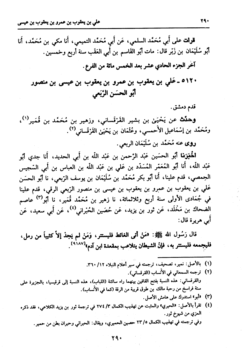 5120 - علي بن يعقوب بن عمرو بن يعقوب بن عيسى بن منصور أبو الحسن الربيعي قدم دمشق وحدث عن يحيى بن بشير القرقساني وزهير بن محمد بن قمير (1) ومحمد بن إسماعيل الأحمسي وعثمان بن يحيى القرقساني (2) روى عنه محمد بن سليمان الربعي أخبرنا أبو الحسين عبد الرحمن بن عبد الله بن أبي الحديد أنا جدي أبو عبد الله أنا أبو المعمر المسدد بن علي بن عبد الله بن العباس بن أبي السجيس الحمصي قدم علينا أنا أبو بكر محمد بن سليمان بن يوسف الربعي نا أبو الحسن علي بن يعقوب بن عمرو بن يعقوب بن عيسى بن منصور الربعي الرقي قدم علينا في جمادى الأولى سنة أربع وثلاثمائة نا زهير بن محمد قمير نا أبو (3) عاصم الضحاك بن مخلد عن ثور بن يزيد عن حصين الحبراني (4) عن أبي سعيد عن أبي هريرة قال قال رسول الله (صلى الله عليه وسلم) من أتى الغائط فليستتر ومن لم يجدد إلا كثيبا من رمل فليجمعه فليستتر به فإن الشيطان يتلاعب بمقعدة ابن آدم