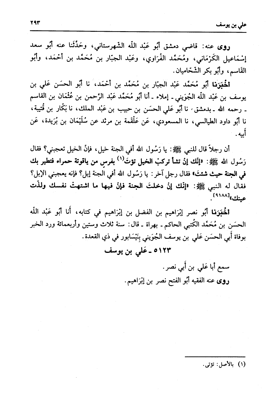 [9188] أخبرنا أبو نصر إبراهيم بن الفضل بن إبراهيم في كتابه أنا أبو عبد الله الحسن بن محمد الكتبي الحاكم بهراة قال سنة ثلاث وستين وأربعمائة ورد الخبر بوفاة أبي الحسن علي بن يوسف الجويني بنيسابور في ذي القعدة 5123 علي بن يوسف سمع أبا علي بن أبي نصر روى عنه الفقيه أبو الفتح نصر بن إبراهيم