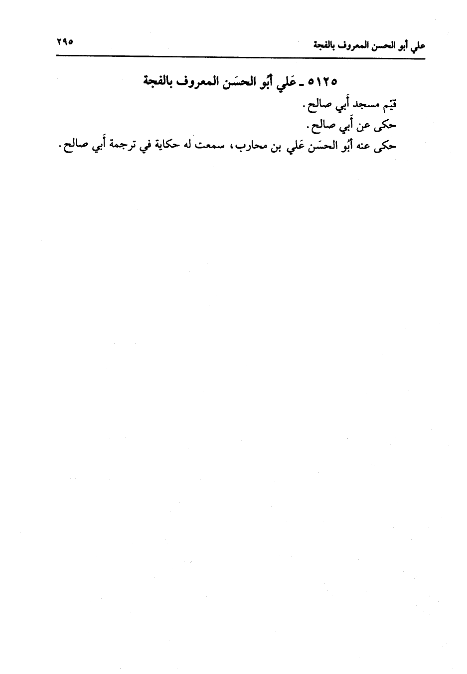 5125 - علي أبو الحسن المعروف بالفجة قيم مسجد أبي صالح حكى عن أبي صالح حكى عنه أبو الحسن علي بن محارب سمعت له حكاية في ترجمة أبي صالح " ذكر من اسمه عمارة "