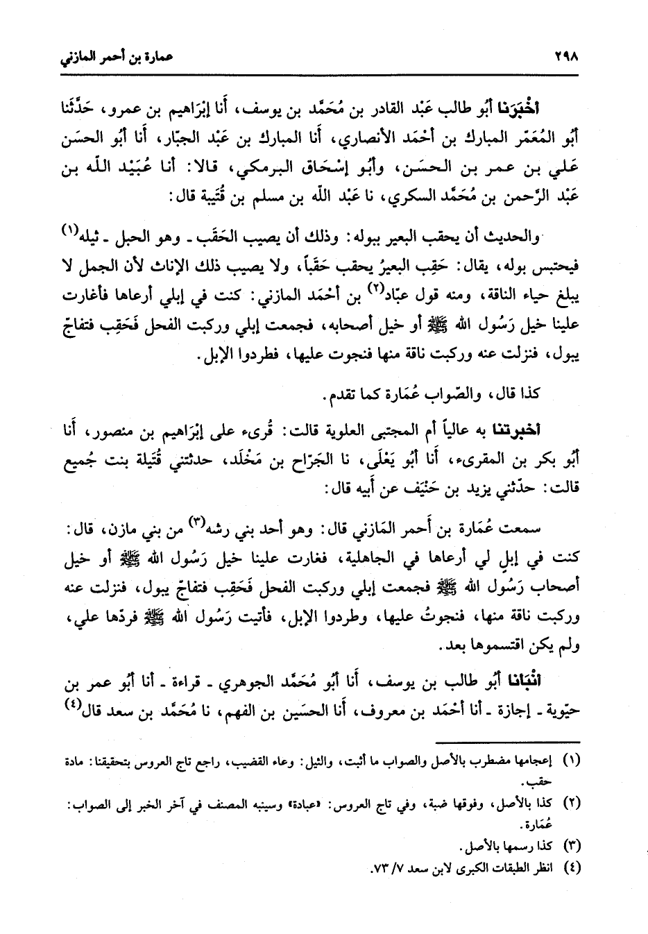 أخبرنا أبو طالب عبد القادر بن محمد بن يوسف أنا إبراهيم بن عمرو حدثنا أبو المعمر المبارك بن أحمد الأنصاري أنا المبارك بن عبد الجبار أنا أبو الحسن علي بن عمر بن الحسن وأبو إسحاق البرمكي قالا أنا عبيد الله بن عبد الرحمن بن محمد السكري نا عبد الله بن مسلم بن قتيبة قال والحديث أن يحقب البعير ببوله وذلك أن يصيب الحقب وهو الحبل ثيله (1) فيحتبس بوله يقال حقب البعير يحقب حقبا ولا يصيب ذلك الإناث لأن الجمل لا يبلغ حياء الناقة ومنه قول عباد (2) بن أحمد المازني كنت في إبلي أرعاها فأغارت علينا خيل رسول الله (صلى الله عليه وسلم) أو خيل أصحابه فجمعت إبلي وركبت الفحل فحقب فتفاج يبول فنزلت عنه وركبت ناقة منها فنجوت عليها فطردوا الإبل كذا قال والصواب عمارة كما تقدم أخبرتنا به عاليا أم المجتبى العلوية قالت قرئ على إبراهيم بن منصور أنا أبو بكر بن المقرئ أنا أبو يعلى نا الجراح بن مخلد حدثتني قتيلة بنت جميع قالت حدثني يزيد بن حنيف عن أبيه قال سمعت عمارة بن أحمر المازني قال وهو أحد بني رشه (3) من بني مازن قال كنت في إبل لي أرعاها في الجاهلية فغارت علينا خيل رسول الله (صلى الله عليه وسلم) أو خيل أصحاب رسول الله (صلى الله عليه وسلم) فجمعت إبلي وركبت الفحل فحقب فتفاج يبول فنزلت عنه وركبت ناقة منها فنجوت عليها وطردوا الإبل فأتيت رسول الله (صلى الله عليه وسلم) فردها علي ولم يكن اقتسموها بعد أنبأنا أبو طالب بن يوسف أنا أبو محمد الجوهري قراءة أنا أبو عمر بن حيوية إجازة أنا أحمد بن معروف أنا الحسين بن الفهم نا محمد بن سعد قال (4)