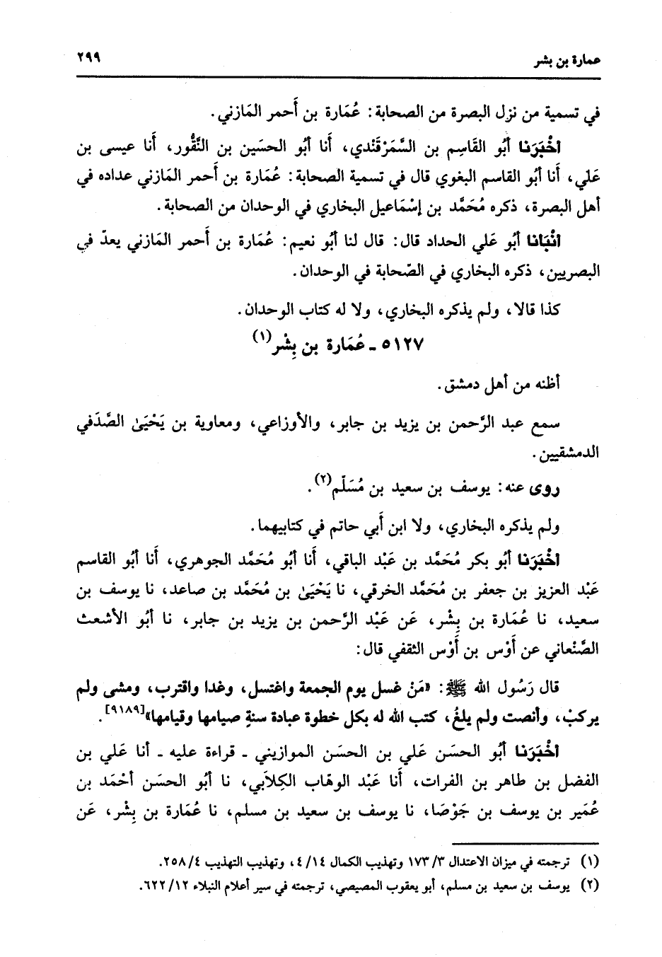 5127 - عمارة بن بشر (1) أظنه من أهل دمشق سمع عبد الرحمن بن يزيد بن جابر والأوزاعي ومعاوية بن يحيى الصدفي الدمشقيين روى عنه يوسف بن سعيد بن مسلم (2) ولم يذكره البخاري ولا ابن أبي حاتم في كتابيهما أخبرنا أبو بكر محمد بن عبد الباقي أنا أبو محمد الجوهري أنا أبو القاسم عبد العزيز بن جعفر بن محمد الخرقي نا يحيى بن محمد بن صاعد نا يوسف بن سعيد نا عمارة بن بشر عن عبد الرحمن بن يزيد بن جابر نا أبو الأشعث الصنعاني عن أوس بن أوس الثقفي قال قال رسول الله (صلى الله عليه وسلم) من غسل يوم الجمعة واغتسل وغدا واقترب ومشى ولم يركب وأنصت ولم يلغ كتب الله له بكل خطوة عبادة سنة صيامها وقيامها