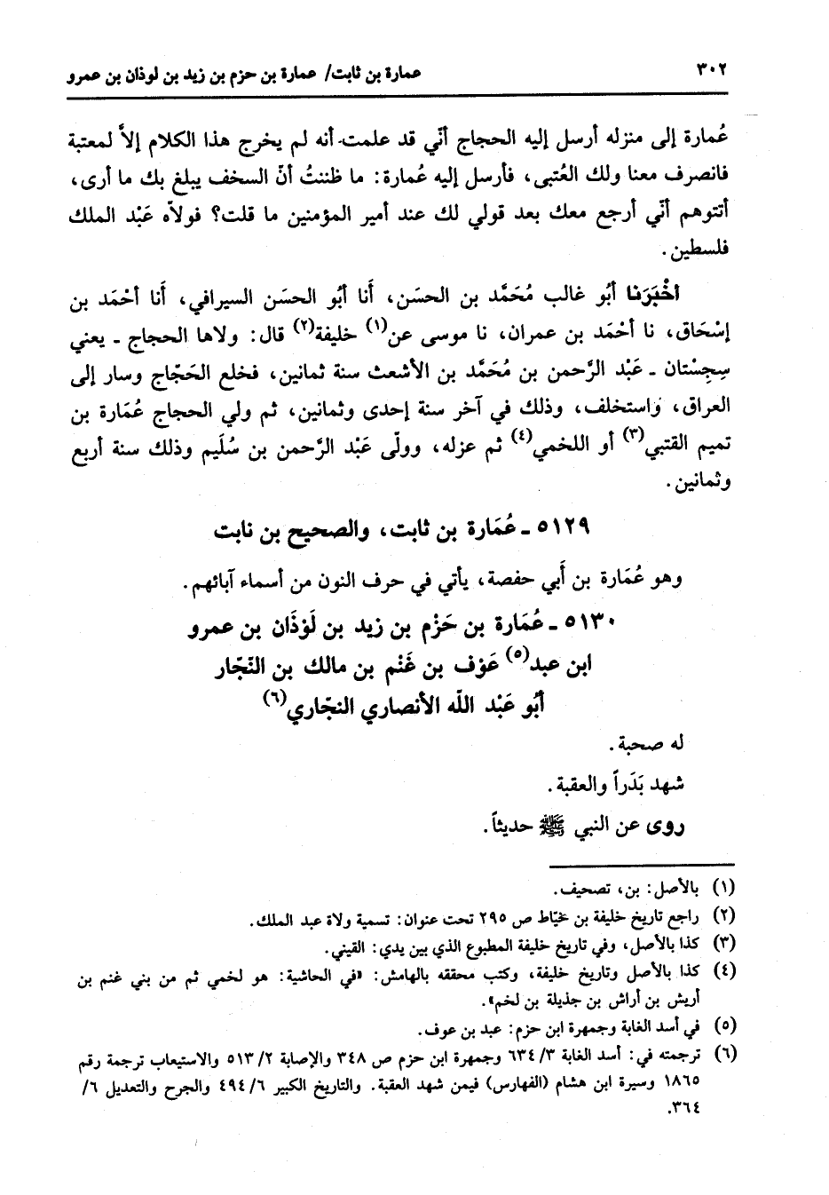 5130 - عمارة بن حزم بن زيد بن لوذان بن عمرو بن عبد (5) عوف بن غنم بن مالك بن النجار أبو عبد الله الأنصاري النجاري (6) له صحبة شهد بدرا والعقبة روى عن النبي (صلى الله عليه وسلم) حديثا